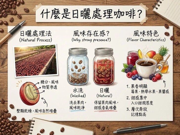 為什麼日曬咖啡的風味特別有存在感?相較水洗處理咖啡,日曬處理讓咖啡豆保留更多來自果肉的風味來源,因此甜感與香氣表現通常更直接、也更有畫面感。這種甜不是單純的糖甜,而是像果醬、熟果、蜜餞般的自然甜潤,喝起來容易留下印象。 也因為風味集中、辨識度高,日曬咖啡常被拿來當作風味型代表,出現在各大精品咖啡豆推薦與手沖咖啡豆推薦名單中。 日曬咖啡豆喝起來有什麼特色?整體來說,日曬處理咖啡常見以下風味輪廓: