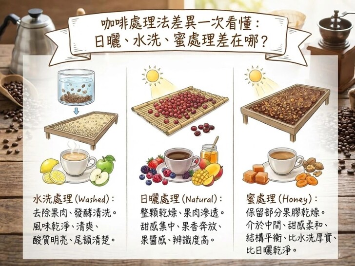 二、咖啡處理法差異一次看懂:日曬、水洗、蜜處理差在哪?水洗處理咖啡:乾淨、清爽水洗處理咖啡(Washed Process)是在採收後,先完整去除果皮與果肉,再透過發酵與清洗,最後進行乾燥。這樣的流程能最大程度降低果肉對風味的干擾,讓咖啡豆本身的品種與產區特色被清楚呈現。 實際喝起來,水洗咖啡的風味線條通常比較乾淨,酸質明亮但不混亂,尾韻收得清楚。這也是為什麼在精品咖啡豆推薦、手沖咖啡豆推薦水洗處理幾乎一定會被提到。對於剛接觸精品咖啡、或在找不酸咖啡豆推薦的人來說,水洗咖啡是非常安全、好理解的起點。 日曬處理咖啡:甜感與果香最突出日曬處理咖啡(Natural Process)則是把整顆咖啡櫻桃直接乾燥,讓果肉與果皮在長時間接觸中,將甜感與香氣慢慢滲入咖啡豆內部。這種處理方式,會讓咖啡喝起來甜感集中、果香奔放、辨識度很高,常見莓果、熱帶水果、果醬或花蜜般的風味印象。 不過,也正因為風味表現直接,日曬處理對農場管理、翻豆頻率與烘焙掌控的要求更高。處理與烘焙到位的日曬咖啡,是甜美迷人的精品代表;但如果控管不足,則可能出現悶味、過熟感或酒感偏重的情況。這也是為什麼在日曬咖啡豆推薦中,特別需要留意品牌與產區穩定度。 蜜處理咖啡:介於中間的平衡派蜜處理咖啡(Honey Process)則介於水洗與日曬之間。處理時會去除果皮,但保留部分果膠直接進行乾燥,依果膠保留量不同,又可細分為黃蜜、紅蜜、黑蜜等類型。在風味表現上,蜜處理咖啡通常比水洗多一點甜感與厚度,又比日曬來得乾淨穩定。甜感柔和、結構平衡、不容易過頭,是很多中焙咖啡豆推薦與日常飲用清單中常見的處理方式。 更多咖啡知識文章 請到 >> https://first-cafe.com 咖啡豆推薦購買 請到 >> https://www.bestbet.tw