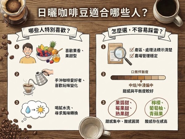 三、日曬咖啡豆適合哪些人?哪些人會特別喜歡日曬咖啡豆?日曬咖啡的風味個性鮮明,並不是人人第一杯就愛,但對某些族群來說,會非常有吸引力。 如果你本身喜歡果香、果甜型咖啡,像是莓果、熱帶水果、果醬或花蜜甜感,那日曬處理咖啡幾乎一定能讓你喝出明顯差異。相較水洗的乾淨清楚,日曬的香氣與甜感更直接,辨識度也更高。 對手沖咖啡愛好者來說,日曬咖啡也很有玩味空間。隨著水溫、注水節奏與萃取時間不同,果香與甜感層次會產生變化,很適合喜歡慢慢沖、慢慢喝的人。 另外,如果你已經喝習慣水洗咖啡,覺得風味開始有點單調,日曬咖啡會是一個很好的轉換選項。它提供另一種完全不同的風味體驗。 日曬咖啡豆怎麼選,比較不容易踩雷?日曬咖啡好喝與否,差距其實很大,選豆時多注意幾個細節,成功率會高很多。 首先,優先選擇產區與處理資訊標示清楚的豆款。有明確產區、海拔、處理法說明的日曬咖啡,通常在農場管理與後製控管上比較穩定,雜味風險也較低。 再來是焙度選擇。對多數人來說,中焙或中淺焙偏中焙的日曬咖啡,甜感與平衡度會比較好。 如果你本身怕酸,但又想試試日曬風味,可以特別留意風味描述用字。像是「果醬甜、莓果甜、熟果甜、花蜜甜」這類描述,通常代表甜感集中、酸感相對圓潤;而「檸檬、葡萄柚、青蘋果」這類明亮水果,多半酸感存在感會比較高。 更多咖啡知識文章 請到 >> https://first-cafe.com 咖啡豆推薦購買 請到 >> https://www.bestbet.tw