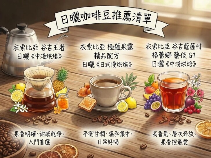 四、日曬咖啡豆推薦清單日曬咖啡豆推薦|衣索比亞 谷吉王者 日曬 咖啡豆《中淺烘焙》如果你在找一款日曬咖啡入門但又有記憶點的豆子,谷吉王者會是很安全的選擇。入口是清新的檸檬與鳳梨香氣,帶有柑橘系的明亮果酸,但不會過於刺激;中段橙花與細緻花香浮現,讓整體風味顯得輕盈、乾淨。尾段則轉為果醬般的甜潤與柔和奶油感,收得圓潤順口。這款日曬咖啡很適合手沖,能清楚感受到「果香明確、甜感乾淨」的日曬特色,也不容易出現悶味或酒感,是很多人第一次愛上日曬咖啡的類型。 日曬咖啡豆推薦|衣索比亞 極蘊果露 精品配方 日曬 咖啡豆《日式慢烘焙》如果你對日曬咖啡有興趣,想嘗試看看,這款日式慢烘焙的日曬配方會非常適合。整體走的是平衡路線,入口滑順甘潤,甜感溫和集中,酸度柔軟不尖。檸檬果韻、鼠尾草清香與焦糖、烤麵包的溫暖甜感交錯出現,層次細膩但不誇張。它保留了日曬咖啡的果甜與香氣,又透過配方與慢烘焙把結構收得很穩,很適合每天喝。 日曬咖啡豆推薦|衣索比亞 谷吉蔻薩村 格蕾娜 藝伎 G1 日曬 咖啡豆《中淺烘焙》如果你想體驗日曬處理+藝伎品種的高香氣版本,這款就是為果香控準備的。一入口就能感受到熱帶水果香氣層層展開,葡萄的甜潤、百香果的奔放、檸檬的明亮酸質與蔓越莓的清爽果韻彼此交織,香氣飽滿卻不混亂。酸甜比例拿捏得很好,尾韻乾淨清爽,讓人一口接一口。這款日曬咖啡豆比較適合已經習慣花果香、果酸結構的人。 更多咖啡知識文章 請到 >> https://first-cafe.com 咖啡豆推薦購買 請到 >> https://www.bestbet.tw