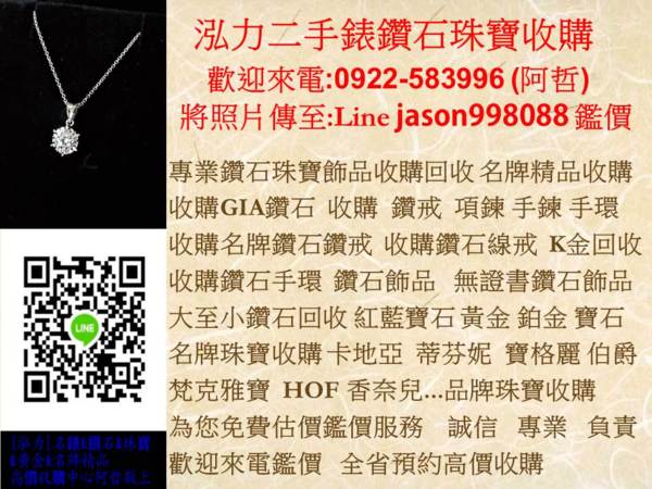 本公司 泓力二手錶鑽石珠寶店 專業經營高價腕錶鑽石珠寶收購買賣交流 泓力二手錶鑽石珠寶店 誠信永續經營 (非當舖體系) 全省高價收購專線:0922583996 阿哲 泓力二手錶鑽石珠寶收購 LINE ID : jason998088 ~傳圖片,為您鑑價~ 請直接按下面 泓力二手錶鑽石珠寶 LINE超連結加入傳照片詢問https://line.me/ti/p/Ck30EF7VBl 請按下左邊LINE網址泓力二手錶鑽石珠寶收購LINE超連結網址 WeChat ID : jason998088 ~傳圖片,為您鑑價~ E MAIL : jason998088@gmail.com ~傳圖片,為您鑑價~ 高價收購 現金交易 全省預約服務 雙北地區來電服務 為您免費估價鑑價服務。 誠信 專業 負責 ~~歡迎來電洽詢~~ 高價鑽石珠寶收購回收 收購鑽石,鑽石鑽戒,鑽石手鍊,鑽石項鍊,鑽石手環、k金戒指、鑽石線戒、紅寶石,藍寶石、黃金收購、白金收購、貴金屬回收 收購珠寶、鑽石收購、京華鑽石收購 大亞鑽石收購 收購Tiffany鑽戒,卡地亞鑽石珠寶、收購蒂芬妮 收購BVLGARI珠寶、收購卡地亞(Cartier) 收購寶格麗(Bvlgari) 收購蒂芬妮 (Tiffany & Co.) 收購伯爵(Piaget) 收購蕭邦 銀座白石鑽石收購 點晴品鑽石收購 周大福鑽石收購 I-PRIMO鑽石收購 蘇菲亞鑽石收購 AMC鑽石收購 收購格拉(GRAFF) 收購梵克雅寶(Van Cleef & Arpels)收購戴比爾斯(DE BEERS) 收購戴瑞(DarryRing) 收購海瑞溫斯頓(Harry Winston) 收購寶詩龍(BOUCHERON) 收購戴瑞(Darry Ring) 收購蒂爵(DERIER) 收購德米亞尼(Damiani) 收購御木本(MIKIMOTO)、收購香奈兒 ‧‧‧‧收購各大品牌精品 鑽戒,鑽石,手鍊,項鍊,k金戒指,收購精品,收購名牌鑽石鑽戒,收購GIA鑽石,線戒鑽石,鑽石飾品收購,收購鑽戒,收購鑽石戒指,收購鑽錶,收購鑽石項鍊、收購鑽石價格,鑽石估價,收購鑽石珠寶,收購鑽石真品,鑽石買賣,回收鑽石,鑽石回收 、GIA鑽石回收、收購鑽石手鍊、收購鑽石項鍊、k金回收、收購二手飾金、K金收購、K金戒指、K金項鍊、K金手鍊、K金耳環 專營鑽石飾品珠寶k金回收,沒有在帶的飾品k金戒指,放著又沒用想變現嗎?一律現金高價回收不論有無證鑽石,GIA,HRD、EGL等...國際證書一律可以回收,或大至小碎鑽的小飾品都可以回收歡迎來電鑑價 |