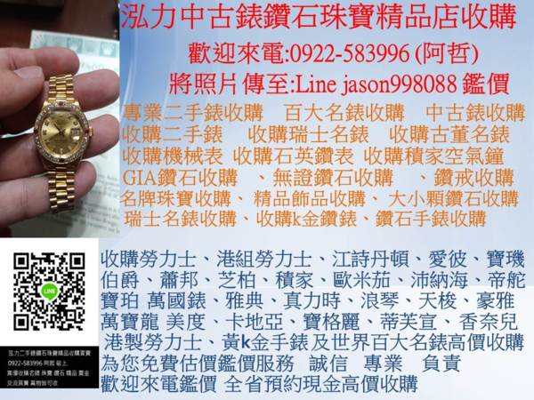 本公司 泓力二手錶鑽石珠寶店 專業經營高價腕錶鑽石珠寶收購買賣交流 泓力二手錶鑽石珠寶店 誠信永續經營 (非當舖體系) 全省高價收購專線:0922583996 阿哲 泓力二手錶鑽石珠寶收購 LINE ID : jason998088 ~傳圖片,為您鑑價~ 請直接按下面 泓力二手錶鑽石珠寶 LINE超連結加入傳照片詢問https://line.me/ti/p/Ck30EF7VBl 請按下左邊LINE網址泓力二手錶鑽石珠寶收購LINE超連結網址 WeChat ID : jason998088 ~傳圖片,為您鑑價~ E MAIL : jason998088@gmail.com ~傳圖片,為您鑑價~ 高價收購 現金交易 全省預約服務 大台北地區來電馬上服務 為您免費估價鑑價服務。 誠信 專業 負責 ~~歡迎來電洽詢~~ 高級名錶高價收購 機械錶收購 中古手錶收購 石英鑽錶回收 勞力士錶收購、收購百達翡麗、收購江詩丹頓、收購寶珀錶、收購寶璣錶、收購愛彼、收購崑崙、收購格拉蘇蒂錶、收購法蘭克穆勒、收購伯爵錶、收購蕭邦錶、收購芝柏錶、收購積家、收購百年靈、收購格林漢、收購歐米茄錶、收購帝舵錶、收購沛納海錶、收購萬寶龍錶、收購IWC萬國錶、收購浪琴錶、收購美度錶、收購天梭錶、收購真力時錶、 收購波爾錶、收購豪雅錶、收購豪利時錶、收購雅典錶 收購愛寶時、收購沛納海錶、收購寶齊萊錶、收購蒂芙尼錶、收購卡地亞錶、收購香奈兒錶、收購寶格麗錶、收購路易·威登錶、收購愛馬仕錶、收購星辰表錶、收購雷達錶、收購精工錶錶、蘇黎世鑽錶手錶…..世界百大名錶收購買賣交流 機械錶收購、石英錶收購、精品珠寶手錶收購、收購古董鐘錶、K金手錶收購、古董手錶收購、收購鑽石手錶、 收購勞力士老錶、港製勞力士收購、K金手錶收購、老款勞力士收購、舊勞力士收購、勞力士配件收購 、勞力士機芯收購 、老表買賣、名錶維修、手上鍊手表收購、 機械表買賣、懷錶收購、中古錶收購、二手手錶收購 、故障手錶收購、手錶配件收購、收購積家空氣鐘、男女鑽錶收購、舊勞力士錶收購、鏤空手錶、收購懷錶、回收舊錶、收購名錶、勞力士配件收購 、勞力士零件收購 收購勞力士金錶 收購老表 收購舊錶 收購瑞士名表 高價名錶收購 收購二手錶店 代客贖回當鋪手錶、代客贖回當鋪珠寶鑽石、黃金收購、白金收購、k金回收