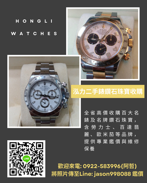 泓力二手錶鑽石珠寶店 專業高價腕錶鑽石珠寶收購買賣交流 泓力二手錶鑽石珠寶店 誠信永續經營 (非當舖體系) 全省高價收購專線:0922583996 阿哲 泓力二手錶鑽石珠寶收購 LINE ID : jason998088 ~傳圖片,為您鑑價~ 泓力二手錶鑽石珠寶LINE超連結傳照片https://line.me/ti/p/Ck30EF7VBl 泓力二手錶鑽石珠寶收購網址 https://www.hongli-up.com FB粉絲專頁https://www.facebook.com/jason998088/ 高價收購 現金交易 全省預約服務 大台北地區來電馬上服務 為您免費估價鑑價服務。 誠信 專業 負責 ~~歡迎來電洽詢~~ 高級名錶高價收購 機械錶收購 中古手錶收購 石英鑽錶回收 勞力士錶收購、收購百達翡麗、收購江詩丹頓、收購寶珀錶、收購寶璣錶、收購愛彼、收購崑崙、收購格拉蘇蒂錶、收購法蘭克穆勒、收購伯爵錶、收購蕭邦錶、收購芝柏錶、收購積家、收購百年靈、收購格林漢、收購歐米茄錶、收購帝舵錶、收購沛納海錶、收購萬寶龍錶、收購IWC萬國錶、收購浪琴錶、收購美度錶、收購天梭錶、收購真力時錶、 收購波爾錶、收購豪雅錶、收購豪利時錶、收購雅典錶 收購愛寶時、收購沛納海錶、收購寶齊萊錶、收購蒂芙尼錶、收購卡地亞錶、收購香奈兒錶、收購寶格麗錶、收購路易·威登錶、收購愛馬仕錶、收購星辰表錶、收購雷達錶、收購精工錶錶、蘇黎世鑽錶手錶…..世界百大名錶收購買賣交流 機械錶收購、石英錶收購、精品珠寶手錶收購、收購古董鐘錶、K金手錶收購、古董手錶收購、收購鑽石手錶、 收購勞力士老錶、港製勞力士收購、K金手錶收購、老款勞力士收購、舊勞力士收購、勞力士配件收購 、勞力士機芯收購 、老表買賣、名錶維修、手上鍊手表收購、 機械表買賣、懷錶收購、中古錶收購、二手手錶收購 、故障手錶收購、手錶配件收購、收購積家空氣鐘、男女鑽錶收購、舊勞力士錶收購、鏤空手錶、收購懷錶、回收舊錶、收購名錶、勞力士配件收購 、勞力士零件收購 收購勞力士金錶 收購老表 收購舊錶 收購瑞士名表 高價名錶收購 收購二手錶店 代客贖回當鋪手錶、代客贖回當鋪珠寶鑽石、黃金收購、白金收購、k金回收 IWC全面「黑化」 計時碼錶帥翻