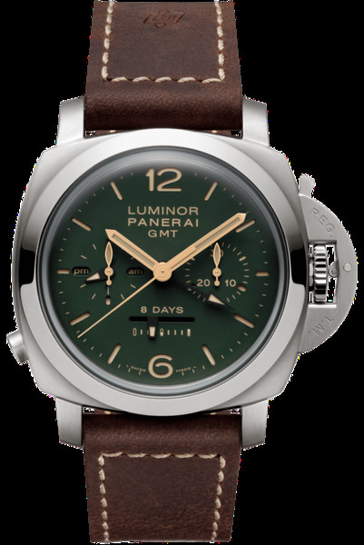 沛納海Luminor 1950 8日動力儲存兩地時間單按鈕計時鈦金屬腕表,約58萬6,000元。 圖/台北101購物中心提供