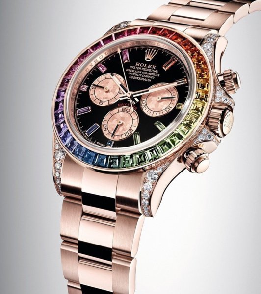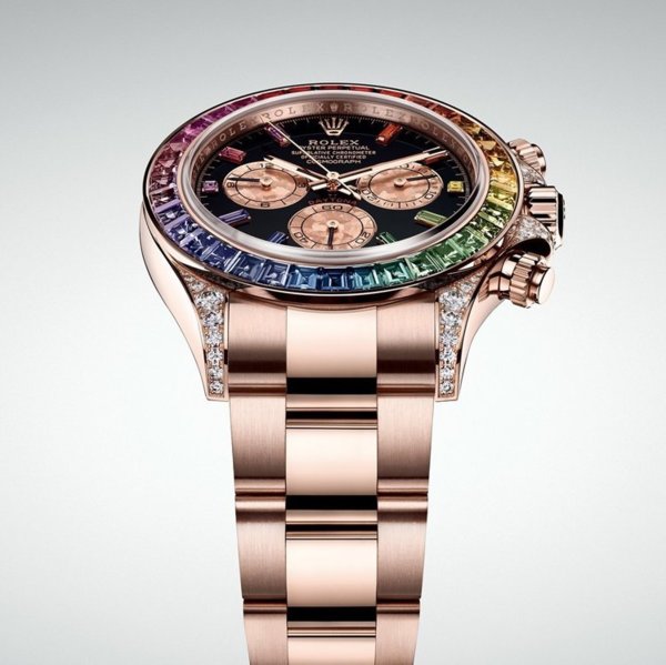 18ct永恒玫瑰金款Cosmograph Daytona,外圈鑲嵌彩虹漸變色藍寶石,錶殼耳及錶冠護肩鑲嵌56顆圓形切割鑽石。 圖/勞力士 提供 4130型恒動機芯 Cosmograph Daytona腕錶搭載4130型自動上鏈機械計時機芯,此機芯全由勞力士研發製造。機芯的構造徹底革新,凝聚勞力士精湛的製錶工藝,大大精簡計時器組件的數量,從而使機芯更為可靠。 堅固的計時機芯配備導柱輪及垂直計時離合輪裝置,可使計時器瞬時啟動,確保精準計時。擺輪游絲組件是腕錶的心臟部件,配備了勞力士藍色Parachrom游絲。 此游絲由勞力士鑄造的獨特順磁性合金製成,不受磁場干擾,即使溫度變化,仍然十分穩定,抗震力更比傳統游絲高十倍。勞力士末圈則確保游絲在任何位置仍可保持規律。4130型機芯配備自動上鏈組件,藉由恒動擺陀為主發條上鏈,其動力儲備約為72小時。