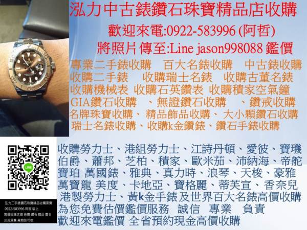 本公司 泓力二手錶鑽石珠寶店 專業經營高價腕錶鑽石珠寶收購買賣交流 泓力二手錶鑽石珠寶店 誠信永續經營 (非當舖體系) 全省高價收購專線:0922583996 阿哲 泓力二手錶鑽石珠寶收購 LINE ID : jason998088 ~傳圖片,為您鑑價~ 請直接按下面 泓力二手錶鑽石珠寶 LINE超連結加入傳照片詢問https://line.me/ti/p/Ck30EF7VBl 請按下左邊LINE址網泓力二手錶鑽石珠寶收購LINE超連結網址 WeChat ID : jason998088 ~傳圖片,為您鑑價~ E MAIL : jason998088@gmail.com ~傳圖片,為您鑑價~ 高價收購 現金交易 全省預約服務 大台北地區來電馬上服務 為您免費估價鑑價服務。 誠信 專業 負責 ~~歡迎來電洽詢~~ 名錶收購、勞力士收購、 百大名錶收購、中古錶收購、k金錶回收、鑽錶收購、鑽石收購 黃金錶、二手錶回收、舊錶出售、中古勞力士買賣、錶舊錶收購、勞力士港製,原裝,好壞全收,二手錶收購 、K金手錶,、蘇黎世錶、二手勞力士買賣,格黎詩丹手錶K金錶 名錶收購 Rolex勞力士手錶、Vacheron Constantin 江詩擔丹頓、PIAGET伯爵手錶、LONGINES浪琴、CHOPARD 蕭邦手錶、CORUM崑崙手錶、Breguet 寶璣、A.Lange&Sohne朗格手錶、BREITLING百年靈、BVLGARI寶格麗手錶、愛彼(AP) 、PATEK PHILIPPE百達翡麗、FRANCK MULLER法蘭克穆勒手錶、Omega歐米茄、Cartier卡地亞、Jaeger積家、IWC萬國錶、Montblanc萬寶龍、ZENITH真力時、PANERAI沛納海、GELISHIDAN格黎詩丹、SURICH蘇黎世...等百大名錶 收購鑽石 鑽石、鑽戒、裸鑽、鑽石項鍊、各式鑽戒、GIA鑽石、鑽石戒指、鑽石飾品、各式證書鑽石、鑽石手鍊、不分品牌鑽石大小,有證書鑽石、無證書鑽石、珠寶、紅寶石、藍寶石,均有回收收購服務,本公司均有意願高價收購。