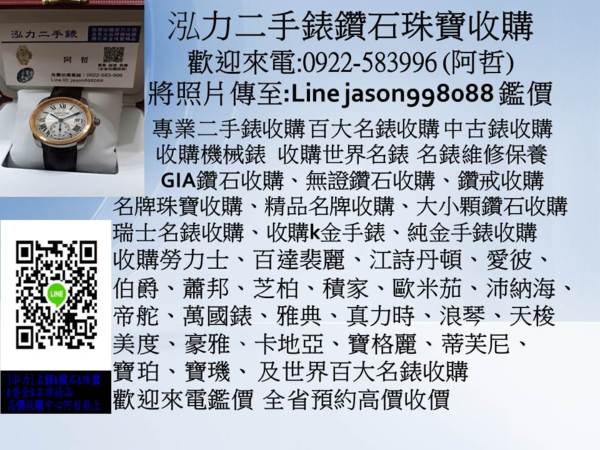 本公司 泓力二手錶鑽石珠寶店 專業經營高價腕錶鑽石珠寶收購買賣交流 泓力二手錶鑽石珠寶店 誠信永續經營 (非當舖體系) 全省高價收購專線:0922583996 阿哲 泓力二手錶鑽石珠寶收購 LINE ID : jason998088 ~傳圖片,為您鑑價~ WeChat ID : jason998088 ~傳圖片,為您鑑價~ E MAIL : jason998088@gmail.com ~傳圖片,為您鑑價~ 高價收購 現金交易 全省預約服務 大台北地區來電馬上服務 為您免費估價鑑價服務。 誠信 專業 負責 ~~歡迎來電洽詢~~ 高級名錶高價收購 機械錶收購 石英鑽錶回收 勞力士錶收購、收購百達翡麗、收購江詩丹頓、收購寶珀錶、收購寶璣錶、收購愛彼、收購格拉蘇蒂錶、收購法蘭克穆勒、收購伯爵錶、收購蕭邦錶、收購芝柏錶、收購積家、收購百年靈、收購格林漢、收購歐米茄錶、收購帝舵錶、收購沛納海錶、收購萬寶龍錶、收購IWC萬國錶、收購浪琴錶、收購美度錶、收購天梭錶、收購真力時錶、 收購波爾錶、收購豪雅錶、收購豪利時錶、收購雅典錶 收購愛寶時、收購沛納海錶、收購寶齊萊錶、收購蒂芙尼錶、收購卡地亞錶、收購香奈兒錶、收購寶格麗錶、收購路易•威登錶、收購愛馬仕錶、收購星辰表錶、收購雷達錶、收購精工錶錶、蘇黎世鑽錶手錶…..世界百大名錶收購買賣交流 收購勞力士老錶、港製勞力士收購、K金手錶收購、老款勞力士收購、舊勞力士收購、勞力士配件收購 勞力士機芯收購 老表買賣、名錶維修、手上鍊手表收購 機械表買賣、機械錶收購、石英錶收購、精品珠寶手錶收購、收購古董鐘錶、K金手錶收購、古董手錶收購、收購鑽石手錶、懷錶收購、中古錶收購、二手手錶收購 、故障手錶收購、手錶配件收購、收購積家空氣鐘、男女鑽錶收購、代客贖回當鋪手錶、舊勞力士錶收購 鏤空手錶 收購懷錶 回收舊錶 收購名錶 勞力士金錶 收購二手錶店 代客贖回當鋪手錶、代客贖回當鋪珠寶鑽石、黃金收購、白金收購、k金回收 高價鑽石珠寶收購回收 收購鑽石,鑽石鑽戒,鑽石手鍊,鑽石項鍊,鑽石手環、k金戒指、鑽石線戒、紅寶石,藍寶石、黃金收購、白金收購、貴金屬回收 收購珠寶、鑽石收購、收購Tiffany鑽戒,卡地亞鑽石珠寶、收購BVLGARI珠寶、收購卡地亞(Cartier) 收購寶格麗(Bvlgari) 收購蒂芬妮 (Tiffany & Co.)收購伯爵(Piaget) 收購蕭邦 收購格拉夫(GRAFF) 收購梵克雅寶(Van Cleef & Arpels)收購戴比爾斯(DE BEERS) 收購戴瑞(DarryRing) 收購海瑞溫斯頓(Harry Winston) 收購寶詩龍(BOUCHERON) 收購戴瑞(Darry Ring) 收購蒂爵(DERIER) 收購德米亞尼(Damiani) 收購御木本(MIKIMOTO)、收購香奈兒‧‧‧‧收購各大品牌精品 鑽戒,鑽石,手鍊,項鍊,k金戒指,收購精品,收購名牌鑽石鑽戒,收購GIA鑽石,線戒鑽石,鑽石飾品收購,收購鑽戒,收購鑽石戒指,收購鑽錶,收購鑽石項鍊、收購鑽石價格,鑽石估價,收購鑽石珠寶,收購鑽石真品,鑽石買賣,回收鑽石,鑽石回收 、GIA鑽石回收、收購鑽石手鍊、收購鑽石項鍊、k金回收、收購二手飾金、K金收購、K金戒指、K金項鍊、K金手鍊、K金耳環 專營鑽石飾品珠寶k金回收,沒有在帶的飾品k金戒指,放著又沒用想變現嗎?一律現金高價回收不論有無證鑽石,GIA,HRD、EGL等...國際證書一律可以回收,或大至小碎鑽的小飾品都可以回收歡迎來電鑑價 收購 Rolex勞力士手錶、Vacheron Constantin 江詩丹頓、PIAGET伯爵手錶、LONGINES浪琴、CHOPARD 蕭邦手錶、CORUM崑崙手錶、Breguet 寶璣、A.Lange&Sohne朗格手錶、BREITLING百年靈、BVLGARI寶格麗手錶、愛彼(AP) 、PATEK PHILIPPE百達翡麗、FRANCK MULLER法蘭克穆勒手錶、Omega歐米茄、Cartier卡地亞、、BLANCPAIN寶鉑、BELL&ROSS柏萊士、CHANEL香奈兒、GIRAD-PERREGAUX芝柏、GRAHAM格林漢、IWC萬國錶、JAEGER-LECOULTRE積家、MONTBLANC萬寶龍、RADO雷達、SEIKO精工、TISSOT天梭、TUDOR帝舵、ULYSSENARDIN雅典、ZENITH真力時 名錶收購 Rolex勞力士手錶、Vacheron Constantin 江詩擔丹頓、PIAGET伯爵手錶、LONGINES浪琴、CHOPARD 蕭邦手錶、CORUM崑崙手錶、Breguet 寶璣、A.Lange&Sohne朗格手錶、BREITLING百年靈、BVLGARI寶格麗手錶、愛彼(AP) 、PATEK PHILIPPE百達翡麗、FRANCK MULLER法蘭克穆勒手錶、Omega歐米茄、Cartier卡地亞、Jaeger積家、IWC萬國錶、Montblanc萬寶龍、ZENITH真力時、PANERAI沛納海、GELISHIDAN格黎詩丹、SURICH蘇黎世...等百大名錶。 收購鑽石、收購鑽戒、收購裸鑽、收購鑽石項鍊、收購各式鑽戒、收購GIA鑽石、收購鑽石戒指、收購鑽石飾品、收購各式證書鑽石、收購鑽石手鍊、收購不分品牌鑽石大小,收購有證書鑽石、收購無證書鑽石、購收珠寶、收購紅寶石、收購藍寶石,均有回收收購服務,本公司均有意願高價收購。 腕表迷沸騰了! 寶璣、寶珀新品接力展出 (詳細全文請至聯合報新聞網 udn STYLE) 不管是藏家還是腕表迷們都要沸騰了,Swatch集團下的兩大品牌寶璣(BREGUET)與寶珀(Blancpain)都有年度重量級新品抵台展出,包括了在今年巴塞爾鐘表上掀起話題的經典系列超薄自動陀飛輪腕表,以及Villeret飛行陀飛輪跳時逆跳分鐘表。