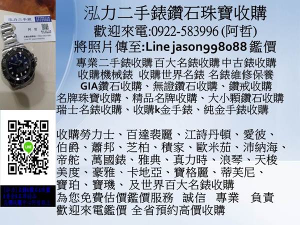 本公司 泓力二手錶鑽石珠寶店 專業經營高價腕錶鑽石珠寶收購買賣交流 泓力二手錶鑽石珠寶店 誠信永續經營 (非當舖體系) 全省高價收購專線:0922583996 阿哲 泓力二手錶鑽石珠寶收購 LINE ID : jason998088 ~傳圖片,為您鑑價~ WeChat ID : jason998088 ~傳圖片,為您鑑價~ E MAIL : jason998088@gmail.com ~傳圖片,為您鑑價~ 高價收購 現金交易 全省預約服務 大台北地區來電馬上服務 為您免費估價鑑價服務。 誠信 專業 負責 ~~歡迎來電洽詢~~ 高級名錶高價收購 機械錶收購 石英鑽錶回收 勞力士錶收購、收購百達翡麗、收購江詩丹頓、收購寶珀錶、收購寶璣錶、收購愛彼、收購格拉蘇蒂錶、收購法蘭克穆勒、收購伯爵錶、收購蕭邦錶、收購芝柏錶、收購積家、收購百年靈、收購格林漢、收購歐米茄錶、收購帝舵錶、收購沛納海錶、收購萬寶龍錶、收購IWC萬國錶、收購浪琴錶、收購美度錶、收購天梭錶、收購真力時錶、 收購波爾錶、收購豪雅錶、收購豪利時錶、收購雅典錶 收購愛寶時、收購沛納海錶、收購寶齊萊錶、收購蒂芙尼錶、收購卡地亞錶、收購香奈兒錶、收購寶格麗錶、收購路易•威登錶、收購愛馬仕錶、收購星辰表錶、收購雷達錶、收購精工錶錶、蘇黎世鑽錶手錶…..世界百大名錶收購買賣交流 收購勞力士老錶、港製勞力士收購、K金手錶收購、老款勞力士收購、舊勞力士收購、勞力士配件收購 勞力士機芯收購 老表買賣、名錶維修、手上鍊手表收購 機械表買賣、機械錶收購、石英錶收購、精品珠寶手錶收購、收購古董鐘錶、K金手錶收購、古董手錶收購、收購鑽石手錶、懷錶收購、中古錶收購、二手手錶收購 、故障手錶收購、手錶配件收購、收購積家空氣鐘、男女鑽錶收購、代客贖回當鋪手錶、舊勞力士錶收購 鏤空手錶 收購懷錶 回收舊錶 收購名錶 勞力士金錶 收購二手錶店 代客贖回當鋪手錶、代客贖回當鋪珠寶鑽石、黃金收購、白金收購、k金回收 高價鑽石珠寶收購回收 收購鑽石,鑽石鑽戒,鑽石手鍊,鑽石項鍊,鑽石手環、k金戒指、鑽石線戒、紅寶石,藍寶石、黃金收購、白金收購、貴金屬回收 收購珠寶、鑽石收購、收購Tiffany鑽戒,卡地亞鑽石珠寶、收購BVLGARI珠寶、收購卡地亞(Cartier) 收購寶格麗(Bvlgari) 收購蒂芬妮 (Tiffany & Co.)收購伯爵(Piaget) 收購蕭邦 收購格拉夫(GRAFF) 收購梵克雅寶(Van Cleef & Arpels)收購戴比爾斯(DE BEERS) 收購戴瑞(DarryRing) 收購海瑞溫斯頓(Harry Winston) 收購寶詩龍(BOUCHERON) 收購戴瑞(Darry Ring) 收購蒂爵(DERIER) 收購德米亞尼(Damiani) 收購御木本(MIKIMOTO)、收購香奈兒‧‧‧‧收購各大品牌精品 鑽戒,鑽石,手鍊,項鍊,k金戒指,收購精品,收購名牌鑽石鑽戒,收購GIA鑽石,線戒鑽石,鑽石飾品收購,收購鑽戒,收購鑽石戒指,收購鑽錶,收購鑽石項鍊、收購鑽石價格,鑽石估價,收購鑽石珠寶,收購鑽石真品,鑽石買賣,回收鑽石,鑽石回收 、GIA鑽石回收、收購鑽石手鍊、收購鑽石項鍊、k金回收、收購二手飾金、K金收購、K金戒指、K金項鍊、K金手鍊、K金耳環 專營鑽石飾品珠寶k金回收,沒有在帶的飾品k金戒指,放著又沒用想變現嗎?一律現金高價回收不論有無證鑽石,GIA,HRD、EGL等...國際證書一律可以回收,或大至小碎鑽的小飾品都可以回收歡迎來電鑑價 誠信 專業 負責 〔泓力二手錶〕 阿哲 敬上 (全省收購服務) 收購二手手錶 鑽石、鑽戒、紅寶石、藍寶石、鑽石、珠寶、精品、黃金,任何錶 ( 老錶 故障錶 k金老錶 不會動的錶 石英錶) 均有意願收購,全省一通電話、專人為您服務 收購 Rolex勞力士手錶、Vacheron Constantin 江詩丹頓、PIAGET伯爵手錶、LONGINES浪琴、CHOPARD 蕭邦手錶、CORUM崑崙手錶、Breguet 寶璣、A.Lange&Sohne朗格手錶、BREITLING百年靈、BVLGARI寶格麗手錶、愛彼(AP) 、PATEK PHILIPPE百達翡麗、FRANCK MULLER法蘭克穆勒手錶、Omega歐米茄、Cartier卡地亞、、BLANCPAIN寶鉑、BELL&ROSS柏萊士、CHANEL香奈兒、GIRAD-PERREGAUX芝柏、GRAHAM格林漢、IWC萬國錶、JAEGER-LECOULTRE積家、MONTBLANC萬寶龍、RADO雷達、SEIKO精工、TISSOT天梭、TUDOR帝舵、ULYSSENARDIN雅典、ZENITH真力時 名錶收購 Rolex勞力士手錶、Vacheron Constantin 江詩擔丹頓、PIAGET伯爵手錶、LONGINES浪琴、CHOPARD 蕭邦手錶、CORUM崑崙手錶、Breguet 寶璣、A.Lange&Sohne朗格手錶、BREITLING百年靈、BVLGARI寶格麗手錶、愛彼(AP) 、PATEK PHILIPPE百達翡麗、FRANCK MULLER法蘭克穆勒手錶、Omega歐米茄、Cartier卡地亞、Jaeger積家、IWC萬國錶、Montblanc萬寶龍、ZENITH真力時、PANERAI沛納海、GELISHIDAN格黎詩丹、SURICH蘇黎世...等百大名錶。 收購鑽石、收購鑽戒、收購裸鑽、收購鑽石項鍊、收購各式鑽戒、收購GIA鑽石、收購鑽石戒指、收購鑽石飾品、收購各式證書鑽石、收購鑽石手鍊、收購不分品牌鑽石大小,收購有證書鑽石、收購無證書鑽石、購收珠寶、收購紅寶石、收購藍寶石,均有回收收購服務,本公司均有意願高價收購。 ROLEX DEEPSEA探索深海必備腕錶 2018-07-20 17:06文/ 勞力士 提供 (詳細全文請至聯合報新聞網 udn STYLE) 勞力士推出新款Oyster Perpetual Rolex Deepsea(蠔式恒動勞力士深潛型)腕錶。 新款搭配44毫米的錶殼,錶耳及錶殼兩側經重新設計,加大的蠔式錶帶配有全新尺寸的摺疊蠔式保險扣。這款專業潛水腕錶首次搭載製錶技術領先的3235型機芯。 新款Oyster Perpetual Rolex Deepsea以蠔式鋼(Oystersteel)製成,搭配D-blue色(深藍漸變至漆黑)錶面。2014年,