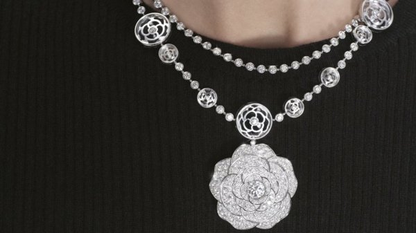 CRISTAL ILLUSION可拆卸式項鍊,山茶花圖騰可轉換成胸針、項鍊可單獨或轉換成為長項鍊、領帶或雙圈頸鍊配戴。白金鑲嵌水晶及鑽石,售價未定。圖/香奈兒提供 首波曝光的作品為CRISTAL ILLUSION系列, 選用香奈兒女士喜愛的水晶與鑽石為