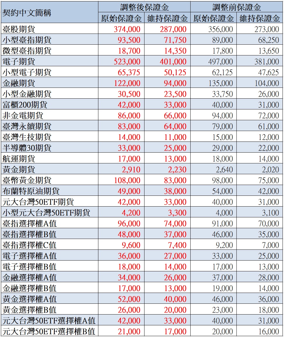 期交所公告調整本公司臺股期貨契約(TX)、小型臺指期貨契約 (MTX)、客製化小型臺指期貨契約(MXFFX)、微型臺指期貨契約(TMF)、電子期貨契約(TE)、小型電子期貨契約(ZEF)、金融期貨契約(TF)、小型金融期貨契約(ZFF)、富櫃200期貨契約(G2F)、非金電期貨契約(XIF)、臺灣永續期貨契約(E4F)、臺灣生技期貨契約(BTF)、半導體30期貨契約(SOF)、航運期貨契約(SHF)、黃金期貨契約(GDF)、臺幣黃金期貨契約(TGF)、布蘭特原油期貨契約(BRF)、元大台灣 50ETF期貨契約(NYF)、小型元大台灣50ETF期貨契約(SRF)、 臺指選擇權契約(TXO)、電子選擇權契約(TEO)、金融選擇權契約(TFO)、黃金選擇權契約(TGO)及元大台灣50ETF選擇權契約(NYO)之保證金金額,並自115年1月27日一般交易時段結束後起實施,請查照。