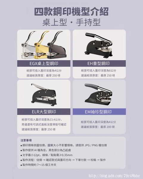 🔧 客製鋼印是什麼?為什麼品牌都在用? 鋼印,又稱壓印章,是透過金屬模具施壓,將圖案壓印在紙張上形成凹凸的立體浮雕效果。 無需墨水、不掉色、耐保存,常見應用包含: LOGO鋼印|品牌識別專用,蓋在保證卡、包裝上超有感 企業識別鋼印|報價單、證書蓋印,展現專業可信 禮品包裝鋼印|節日卡片、客製封套的加分小巧思 結婚證書、手作小物|打造個人化的紀念 🖨 四款鋼印機型怎麼選?(桌上型 vs. 手持型) 🖥 桌上型鋼印|EGX / ELR / EH 適合大量壓印、厚磅紙張使用,圖案最大可壓至 直徑5公分,紙張建議不超過 250磅。 EGX 桌上型鋼印:紙張可插入蓋印深度為4公分,精巧好操作,適合一般企業與個人使用 ELR 大型鋼印:紙張可插入蓋印深度為13.4公分,旁邊還有可調式進紙深度導版可看;蓋印面積大,適合需大圖案的品牌應用 EH 重型鋼印:紙張可插入蓋印深度為6公分,施力穩定、結構紮實,適用厚卡或連續工作 ✋ 手持型鋼印|EM 紙張可插入蓋印深度為4公分,圖案最大 直徑4公分,紙張厚度建議不超過 200磅。 輕巧便攜,適合活動現場臨時壓印、少量製作等用途。 🖼 圖稿準備怎麼做?常見問題一次說明 想要壓得清楚、好看,圖稿準備也有眉角! ✔ 初步估價:請提供 JPG / PNG 檔 便於我們評估圖稿複雜度,初步提供價格建議。 ✔ 正式製作:請提供 AI 向量檔(黑白稿) 黑色區塊 = 壓印後凸起區域 圖案大小不影響價格,價格依圖案複雜度計算 文字建議最小 12pt,過小可能只呈現輪廓 線條/點點最細需達 0.35mm,細節才能完整呈現 ✅ 不會做 AI 檔沒關係,提供簡單文字圖案,我們可代為協助轉檔設計(將酌收設計費) . ⚠ 鋼印使用注意事項1. 鋼印適用於紙張類材質,無法壓印在護貝、塑膠或油性表面 2. 建議搭配未上膜紙張(如棉紙、卡紙)使用,壓印效果更佳 🧾 鋼印下單流程 1. 提供圖檔估價(JPG/PNG) 2. 確認鋼印機型與蓋印方向 3. 下單並付款(可全額 or 付 50% 訂金) 4. 提供校稿圖給您確認 5. 校稿確認後製作 製作時間約 7–15 個工作天(不含假日) . 📦 出貨方式 宅配 超商店到店 台北/台南門市自取(皆採預約制) 📣 客製鋼印,讓品牌與眾不同 當你蓋上那一枚壓得剛剛好的鋼印,那種立體的觸感與視覺衝擊,將會成為品牌溝通的一種語言。 它不只是一個圖案,更是一種專業與質感的保證。 如果你也想為你的品牌、創作或文件加上一點「質感細節」,歡迎將圖稿私訊我們,立即幫你評估最適合的鋼印方案! 📍 聯絡資訊與平台連結 加官方LINE@將有專人為您服務 【 LINEI D】@wystamp - 🔴 台北門市 【🏬】台北市中正區濟南路二段48巷5-5號 (預約制) 【☎】02-2358-1811 - 🔴 台南門市 【🏬】台南市東區東門路三段37巷21號(預約制) 【☎】0907-077-126 - 【唯原工藝官網】https://wystamp.com.tw/