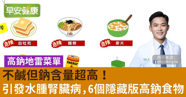 【早安健康/泌尿科 高銘鴻醫師】 不鹹也高鈉?高鈉地雷菜單、生活中的美食陷阱 你知道重鹹對身體不好,但你知道很多不鹹的食物也是高鈉一族嗎?如果三餐都外食,很容易已經鈉超標(台灣人普遍超標一倍以上)。生活中的小點心再吃上高鈉,真的會變鈉美人(怕),衛福部建議,成人每日鈉總攝取量不宜超過2,400毫克。 高鈉飲食會引發很多健康風險,像是: 腎臟疾病 心血管疾病 高血壓、中風 更年期女性髖骨密度流失 胃部發炎 水腫 失智 【NG高鈉隱藏菜單】 早餐地雷:白吐司、蔬果汁、麥片、玉米片、鐵板麵 正餐地雷:白麵條、涼麵、火鍋湯、關東煮、拌醬 點心地雷:果凍、運動飲料、夾心餅乾、洋芋片 高鈉飲食是台灣非常嚴重,而且需要正視的飲食問題,我跟太太都已經養成買東西先看營養標示,如果沒有營養標示,則要生活中多累積知識來幫助自己判斷,身體健康最重要,大家覺得有幫助可以多分享,讓你愛的人都吃得更健康! 高鈉隱藏菜單 原文出處:大禹治水 恩主公醫院 高銘鴻醫師 三峽北大泌尿科 來自網路https://edh.tw/articles/HCEKHfJ 純屬分享若有侵權請來信告知,會即刻刪除,謝謝。