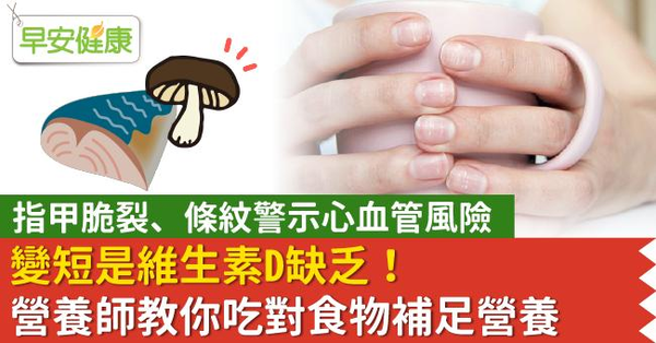 【早安健康/蔡經謙報導】指甲出現容易碎、斷裂、斑點、條紋等狀況,看似只是影響外觀的小問題,卻也暗示身體可能缺乏某些營養素。一名50多歲女性,因發覺手指甲與指甲床連接的部分越來越短,本以為是指甲受傷所致,就醫抽血檢查後才發現原來是身體缺乏維生素D造成!收治患者的書田診所家醫科主任醫師何一成提醒,當身體缺乏某些營養素會引起指甲變化,如大小改變、指甲面出現斑點、條紋、指甲容易碎裂等,都可能是缺乏不同營養素所致! 缺維生素D的跡象:手指甲與指甲床連接的部分越來越短 指甲4狀況可能是缺乏營養素引起!白點、條紋、易斷裂、脆弱都要留意 綜合美國瓦爾登大學(Walden University)護理學教授Cynthia Cobb、英國足科醫師(podiatrist)Marion Yau、Ivan Bristow等人的資料,《早安健康》整理出缺乏部分營養素後,指甲可能出現的4大異狀供民眾參考: 白點、白線: 若指甲出現白點,甚至白線,可能是缺乏鋅、鈣、鐵的徵兆,可至醫院抽血檢查,確認後盡速補充。需要特別注意的是,指甲白點也可能由真菌感染所導致,若指甲不止有白斑,還同時出現易碎等症狀,應盡速至醫院請醫師診斷,並擦藥治療。 指甲缺乏鋅鐵鈣:白點、白線、白斑 直線條紋: 指甲直條紋常出現在高齡者身上,是新細胞產生的速度變慢導致,為正常老化現象。不過若年輕人常出現該狀況就要留意了,可能是因缺乏維生素A、鋅、鈣或鐵所致。 需要留意的是,該狀況也可能由疾病造成,部分疾病會使指甲的生長速度暫時變慢,當指甲重新開始生長,就可能產生線條。這些疾病包括:流行性腮腺炎、糖尿病、副甲狀腺亢進等會影響荷爾蒙,阻礙身體吸收鈣質的疾病。 指甲缺乏維生素A、鋅、鈣或鐵:直線條紋 指甲沒有月牙痕(指甲底部的白色半月形狀): 若指甲底部沒有月牙痕,可能是缺維生素B12的徵兆,缺乏維生素B12會導致紅血球變少,造成貧血、缺氧,從而讓指甲變得蒼白,就好像月牙痕消失一樣。 此外,由於紅血球也有為指甲輸送營養的重要功用,當紅血球不足,指甲也會變薄、變易碎,甚至造成「匙狀甲」(指甲薄且凹陷如湯匙)。 缺乏營養素的跡象:指甲沒月牙 指甲易碎、脆弱、變軟: 若發現指甲易碎、斷裂,出現甲裂(onychoschizia)症狀,除了常由洗碗等反覆弄濕、乾燥雙手等因素造成外,也可能是缺鐵的徵兆。當身體缺鐵,也會導致紅血球變少,令指甲變脆弱;而指甲變軟除了可能是用過多去光水、清潔劑所致外,也可能是缺乏維生素B群、鈣質、鐵或脂肪酸造成。 缺乏6營養素小心疾病上身!營養師透露補充秘訣