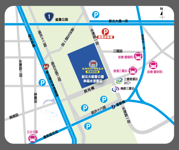 (圖為新北市政府) 大眾運輸工具: 1. 台北捷運 可搭乘臺北捷運中和新蘆線到達三重站後,於三重站的出口1依循引導指標進入新北大都會公園。