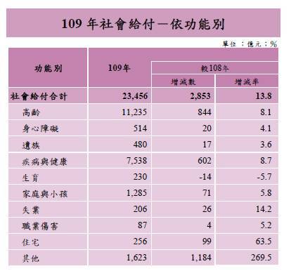 三、社會給付依功能別觀察,109 年以高齡1 兆1,235 億元(占47.9%)最多,其次為疾病與健康7,538 億元(占32.1%),兩者合計占8 成,另「其他功能」占6.9%,家庭與小孩占5.5%分居三、四。與108 年相較,有9項功能別給付增加,其中以「其他功能」給付增1,184 億元(增269.5%)最多,主因109 年受COVID-19 疫情影響,新增薪資及生活費等相關紓困補助所致,其次為「高齡」給付增844 億元(增8.1%),主因退休給付請領人數增加及長照服務量能提升所致;僅「生育」1 項功能別減少,主因109 年新生兒人數減7.9%,生育給付減14 億元(減5.7%)。