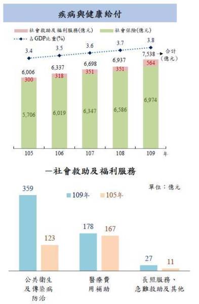 陳思緯老師的提醒: 一、依國際勞工組織(ILO)規範,疾病與健康給付涵蓋維持、恢復或改善被保障者健康及其工作能力之給與,及因傷所給予的醫療給付。109 年疾病與健康給付 7,538 億元,較 108 年增 602 億元或增 8.7%,主因健保給付成長 5.9%及因應嚴重特殊傳染性肺炎(COVID-19)增加相關防治給付所致,與 105 年相較,亦增 1,532 億元或增25.5%;占 GDP 比重由 105 年之 3.4%增至 109 年之 3.8%。