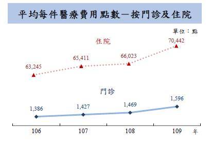 二、依計畫型態觀察,109 年以「社會保險」計畫給付 6,974 億元,占 92.5%為大宗,主要為健保醫療給付,「社會救助及福利服務」計畫 564 億元,占 7.5%;與 108 年相較,後者增 60.9%大於前者(增 5.9%)。觀察「社會救助及福利服務」計畫主要給付項目,109 年以「公共衛生及傳染病防治」359 億元(占 63.6%)較大,其次為「醫療費用補助」178 億元(占 31.6%);與 105年相較,以「公共衛生及傳染病防治」増236 億元或增 192.7%較多,主因 109 年爆發 COVID-19 疫情,增加相關防治給付所致,其次為「長照服務、急難救助及其他」增 16 億元或增 156.9%,主要為長照相關給付增加。 三、近年受人口老化、對急重症病患加強照護、新藥與新醫療科技及民眾需求增加等因素影響,醫療費用持續增加。依中央健康保險署統計,109 年健保門住診平均每件醫療費用點數分別為 1,596 點及 70,442 點,較 108 年各增.6%(或增 127 點)及增6.7%(或增 4,419 點),與 106 年相較,門診增 15.2%,住院增 11.4%。