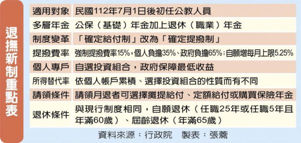 行政院會昨拍板退撫新制相關修正草案,退撫新制由現行「確定給付制」改為「確定提撥制」,適用明(112)年7月1日以後初任公教人員,將設立個人專戶,每月強制提撥費率為15%,初任人員負擔35%、政府負擔65%;初任人員也可自願增提,每月上限為5.25%。公私校教師年資可相互採計,以利教育人才流通。