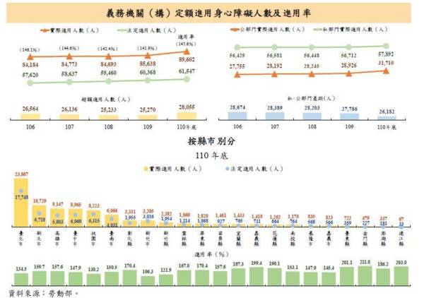 陳思緯老師的提醒: 一、 為保障及促進身心障礙者就業,依「身心障礙者權益保障法」規定,義務機關(構)須定額進用具就業能力之身心障礙者(以下簡稱身障者)。依勞動部統計,110 年底法定應進用身障者之義務機關(構)計1.8 萬家(其中未達法定進用1,772 家),法定須進用身障者計6.2 萬人,較109 年底增1,179 人或增2.0%,與106 年底相較亦增6.8%,已連續4 年增加;觀察實際進用人數,110 年底為9.0 萬人,超額進用(實際超過法定進用)2.8 萬人,較109 年底增3,964 人或增4.6%,進用率145.6%,較109 年底增3.7 個百分點。 二、 按機關(構)部門觀察,110 年底公、私部門實際進用身障者人數分別為3.2 萬人(占35.4%)及5.8 萬人(占64.6%),較109 年底各增2,784 人及增1,180 人;與106 年底相較,公、私部門實際進用身障人數亦均增加,其中公部門增14.2%,增幅高於私部門(増2.6%),致進用差距由106 年底私部門大於公部門2.9 萬人,逐年縮減至110 年底2.6 萬人。 三、 按縣市別觀察,110 年底義務機關(構)法定及實際進用身障者人數均以臺北市(分別為1.8 萬人及2.4 萬人)最高,連江縣(分別為33 人與67 人)最低;觀察各縣市進用率,110年底計22 個縣市超過100%(超額進用),其中以金門縣、連江縣及臺東縣超過1 倍較多,分別為211.0%、203.0%及201.1%。