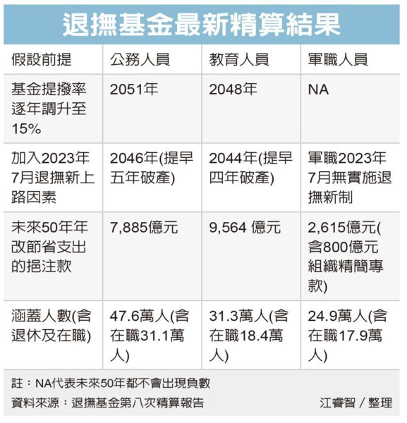 退撫基金第八次精算報告(以 2020 年 12 月底為基準日)日前出爐。報告中依公務人員、教育人員、軍職人員三類未來 50 年收支及財務、並納入明(2023)年 7 月新進公務員及教師將適用新制退撫等條件,進行精算。 報告指出,由於年改挹注款增加,提撥費率自 2021 年提高為 13%、2022 年提高為 14%、及 2023 年以後 15%的前提下,公教人員及教育人員基金首度收支不足年度皆出現在 2035 年;至於破產年分別為2051 年及 2048 年。若和前一次精算報告相較,公務人員退撫基金破產年限延後十年,教育人員延後八年。至於軍職人員基金資產餘額皆維持正數,亦即軍職人員未來 50 年無破產問題。 退撫基金財務攸關約 104 萬退休及在職軍公教退休生活保障。銓敘部高層官員表示,退撫基金破產年限大幅延後、財務穩定維持二、三十年,要歸功於年金改革,以及近三年提撥費率由原本 12%上限逐年調升至 15%。 官員表示,明年 7 月 1 日上路的退撫新制雖會使退撫基金提前五年破產,但「公務人員退休資遣撫卹法」明訂,因退撫新制實施致既有退撫基金財務出現缺口,將由政府撥補。所以,現在逾 67 萬在職軍公教人員,安啦。 自明年 7 月開始,新進公務人員、新進教師將另立新基金,不再參加既有退撫基金,勢將讓退撫基金財務惡化,使基金用罄年限提早。根據精算,公務人員基金首度出現當年度收支不足情形提早至2033 年,2046 年基金累積餘額開始出現負數,之後負數金額逐年上升。亦即公務新進人員退撫新制將影響基金現金流量,預估使基金用罄年度提早五年。 至於教育新進人員明年 7 月起另立基金,也有相同影響。精算報告指出,教育人員基金首度出現當年度收支不足情形提早至 2033 年,2044 年基金累積餘額開始出現負數,之後負數金額逐年上升。 報導原文網址:https://reurl.cc/x1Q3kL |
