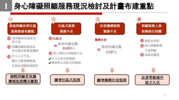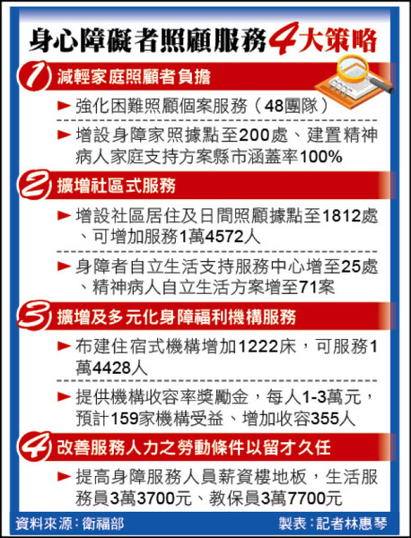 衛福部專案小組 2 年來盤點諮詢 祭 4 大策略 衛福部兩年前組成專案小組與地方政府著手盤點資源,並諮詢專家、身障團體意見,規劃減輕家庭照顧者負擔、擴增社區式服務、擴增及多元化身障福利機構服務、改善服務人力之勞動條件以留才久任等四大策略。 身障家庭照顧者支持中心據點將提升至 200 處 福部社會及家庭署署長簡慧娟指出,身障家庭照顧負荷仍沉重,對困難照顧個案家庭,部分縣市尚無專業團隊,社工人力不足也難以主動發掘、追蹤。未來與長照據點共融,身障家庭照顧者支持中心(家照)據點將從卅五處提升至兩百處,並在社會局處中設置「身心障礙者服務中心」,主動發掘需求並透過障礙者狀態分級,接住高照顧負荷家庭及困難照顧個案。 在擴增社區式服務方面,簡慧娟說,現有八六一處社區居住及日間照顧據點,透過五年計畫可望提升至一八一二處,服務人數成長至二萬九六七二人,增加一萬四五七二人,同時結合國家住都中心,將社區式服務據點納入社會住宅,朝一縣市一社宅三據點目標邁進,並透過自立中心、自立方案的布建,協助身障者、精神病人自立生活。