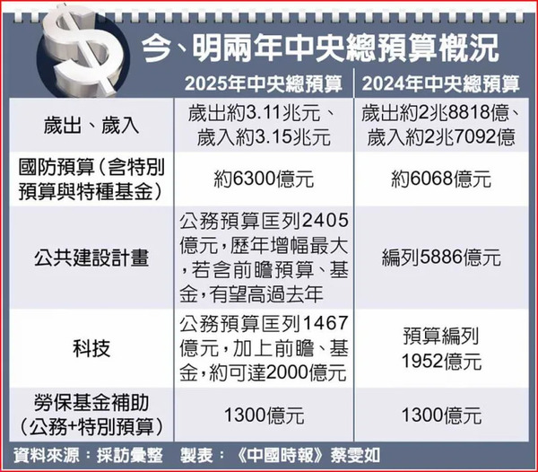 據悉,今年在社福、國防、教育、經濟支出編列上皆有所成長,社福預算上看 9000 億元;國防預算額度約 4600 億元,若含特別預算與特種基金將達 6300 億元;在「公共建設計畫」公務預算匡列 2405億元,若含前瞻、基金,明年預算編列達 6000 億元。科技預算部分,由於賴政府主打經濟科技發展,公務預算匡列 1467 億元,加上前瞻 129 億元、基金,可達 2000 億元,遠高於今年的 1569 億元。 行政院發言人陳世凱表示,歲出部分,以提升公共建設計畫預算在未加計前瞻特別預算下,增加幅度最高,藉此加強改善公路交通、提升人行安全、推動客運車輛電動化。 衛福部次長呂建德說明,「少子女化對策」編列 1201 億元,絕大部分是在教育部,衛福部編列 288億元,除持續發放育兒津貼和托育補助外,也推出新措施,準公共保母通過考核且持續收托,獎助由1.2 萬元調整為 1.8 萬元,以及補助居家保母訪視人員薪資 3000 元,以強化預防兒虐事件;另與教育部合作推動家外送托率,現行 0 到 3 歲為 31%,明年預計提升到 32.6%。 至於「長照經費」編列 876 億元,包括長照基金 828 億元,以及跨部會長照相關預算 48 億元。呂建德說明 3 項重點,首先是長照服務涵蓋率,明年目標是從 8 成提升到 8 成 3,其次是持續布建長照據點,明年目標從 1.2 萬處提高到 1.5 萬處,另呼應「AI 行動內閣」政策,獎勵長照機構導入 AI 智慧科技,明年目標達 770 家。 面對勞保基金即將在 2028 年用罄,政府今年編列 1300 億預算撥補,勞動部長何佩珊先前表示,明年還會有 1300 億,撥補水位不會走回頭路,「做不到就負責」。台大國發所兼任副教授辛炳隆建議,如撥補成常態,應有更穩定的財源,台灣營業稅為 5%,是較低的額度,應可再提高 2%,作為撥補勞保基金的穩定財源。 報導原文網址:https://reurl.cc/QEdlDb |