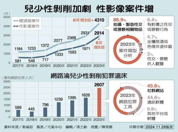 衛福部保護司統計,二○一七年兒少性剝削通報案件共一一八四件,去年高達四三一○件,而截至今年上半年,累積二二一五件兒少性剝削通報案件。去年通報案件中,使用網路工具犯罪者二六○七人次,高於非網路犯罪一○九五人次,網路犯罪工具包括社群網站、通訊軟體、雲端儲存空間、網路論壇等。
