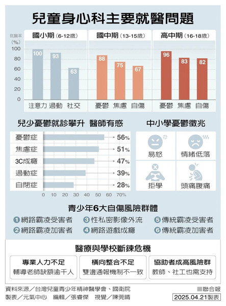 陳思緯老師的提醒: 新世代青少年面臨多重的心理困境,即使「學生輔導法」上路十年,仍接不住霸凌、自殺、暴力事件等複雜個案。專家呼籲,政府應更重視兒少身心風暴,強化社政、衛政、教育等各部門的網路與資源連結,接住每一個需要幫助的孩子。 立法委員陳培瑜表示,「學生輔導法」實施多年,但學校輔導老師明顯不足,絕大部分學校的專輔人員、輔諮中心的專輔人員,仍未聘達法律規定的人數。包含發展性輔導、介入性輔導、處遇性輔導等「三級輔導」系統普遍超載,光國小就缺了近千名輔導老師。 陳培瑜認為,政府應著手改善並補強人員不足、專業培訓等問題。此外,學生家長也需專業支持的協助,一起組成扶持團隊。 國教行動聯盟理事長王瀚陽表示,專輔人力嚴重不足,地處偏遠的學校因班級數未達標準,而聘請「行動諮商師」負責輔導,不過,不夠熟悉個案的輔導人員,怎麼會知道孩子的困難點?遇到哪些問題?建議提升校園專責輔導人力,且需專業分工,例如,由社工至學生家中或社區進行訪視、諮商。 王瀚陽指出,政府提出「全民心理健康韌性計畫」,六年投入逾五十億元國家預算,成效尚待評估。建議從更前端投入中小學心理防治領域,並串聯資源整合,從源頭的預防做起,更勝於治療的諮商輔導。 社會環境愈趨多元複雜,身心狀況異常學生也愈來愈多,台安醫院心身醫學科暨精神科主治醫師許正典表示,除了教育現場的專業輔導人力,應考慮家庭關係、社會價值,大家一起解決兒童、青少年的心理不安。 憂鬱自傷 躍居兒心科就診之冠 研究顯示 性私密影像外流、網路霸凌等為關鍵 (114.4.22新聞報導) 醫師:抱怨不舒服、不想上學是警訊 台灣兒童青少年精神醫學會發布兒少心理健康調查,近三年,憂鬱症、自殘等兒少患者明顯增加,位居兒童身心科門診診斷類別第一名。此外,確診為憂鬱症的孩子屬於自殺高風險族群,從國小起就有自殺或自傷等意念,需要家長、專家關注。 該項研究係針對上百名兒童身心科醫師進行調查,研究顯示,近年來,因注意力不足過動症、自閉症等先天性因素較高的情緒障礙困擾的兒少,至身心科就診的人數變動不大,反觀與環境互動、環境誘發有關的憂鬱症、焦慮症,已成為兒心科患者主要就診原因。 台灣兒童青少年精神醫學會理事長林健禾表示,臨床研究證實,百分之三十五的心理疾病於個案十四歲前就逐漸發展,若孩子情緒問題未能獲得改善,將會影響日後人格特質。青少年發育快速,又面臨求學、人際社交等壓力,如果缺乏團體支持與陪伴,容易產生無助感或憂鬱傾向。