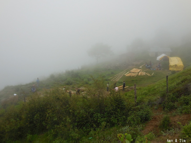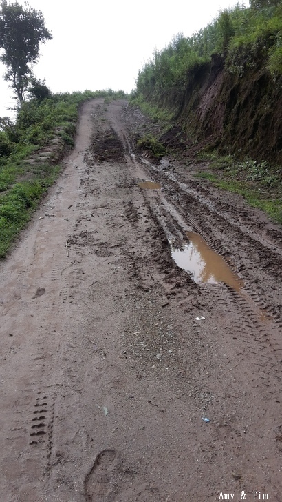 7月是大雷雨季山路滿是泥濘 終於看見黃色帳棚的學校了,週圍的木頭是今天要動工的小學教室!