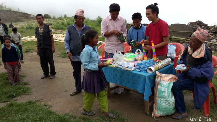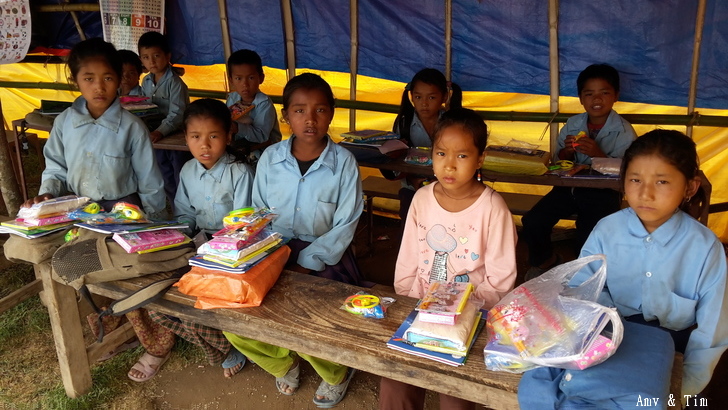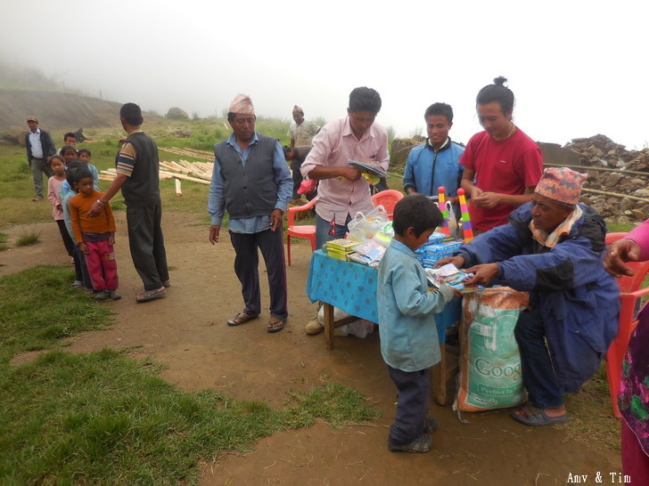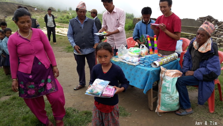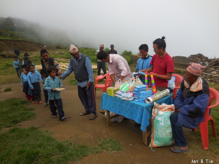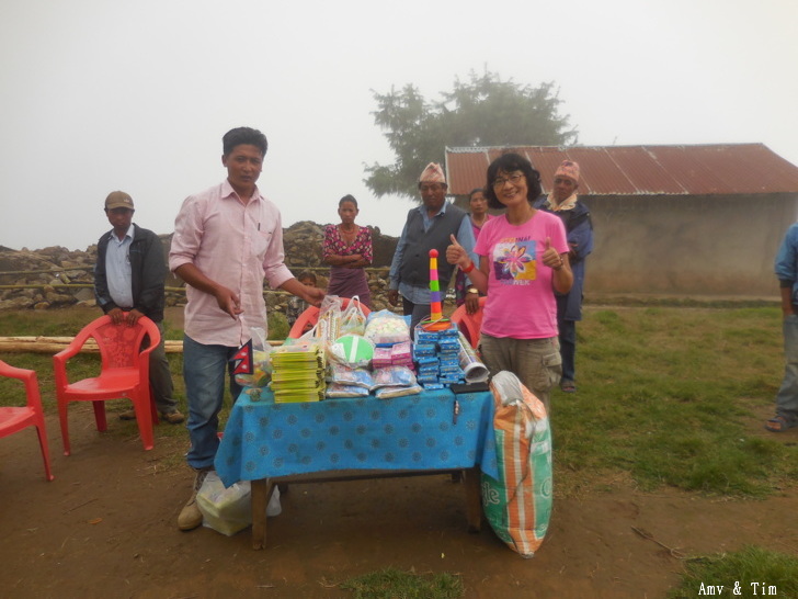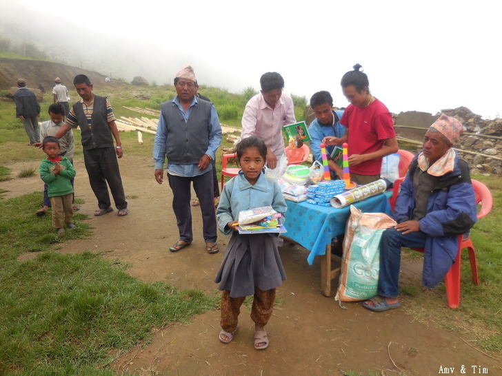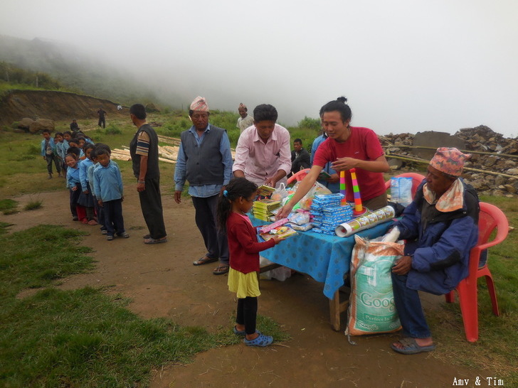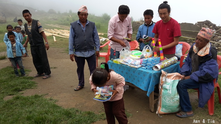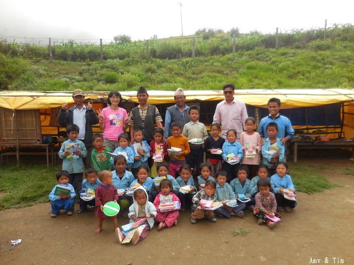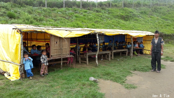 地震後把原來的教室給震垮了,黃色帳棚是臨時搭建的上課地點! 謝謝台灣朋友的愛心捐款,Amy幫你們把禮物背上2700公尺高山給孩子們! 謝謝村長和校長以及表哥的大力幫忙 原本預訂只發給學校的學生們,但沒想到全村的孩子都來了!