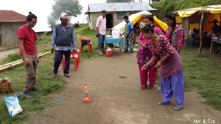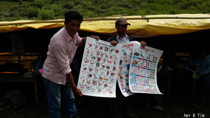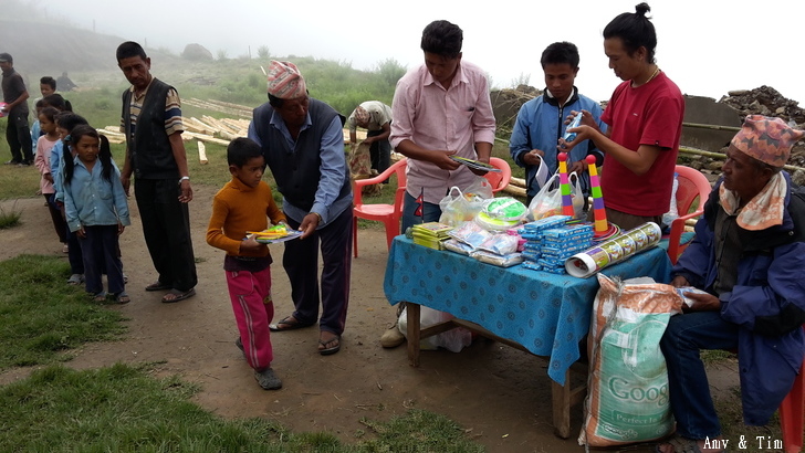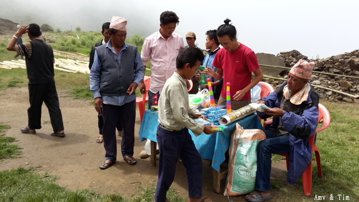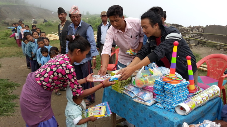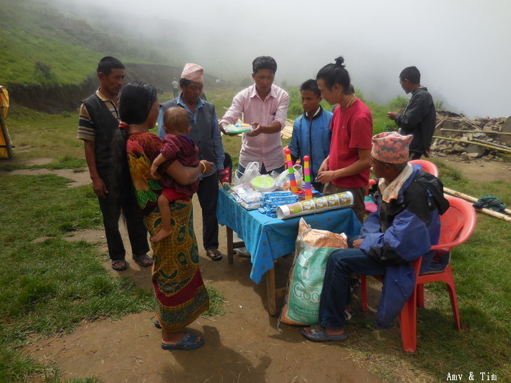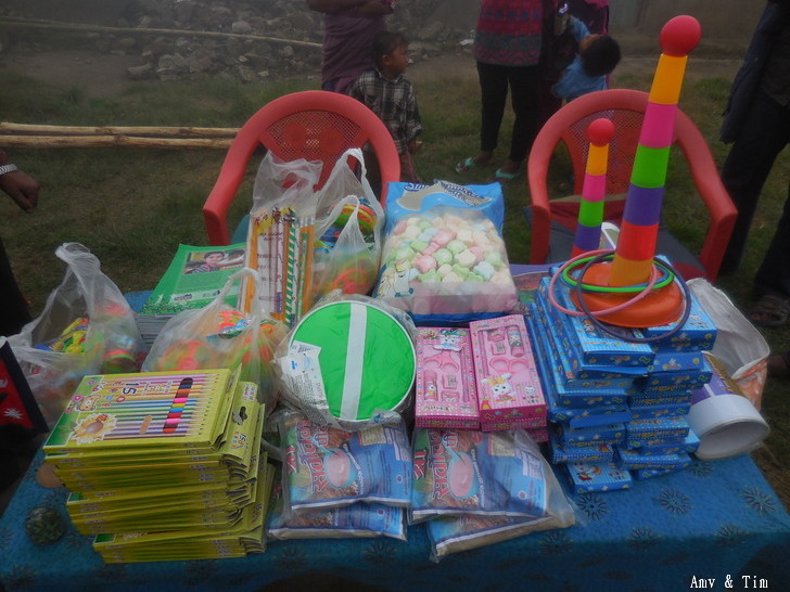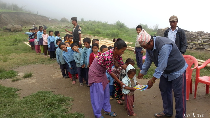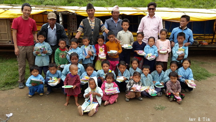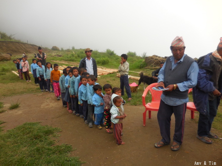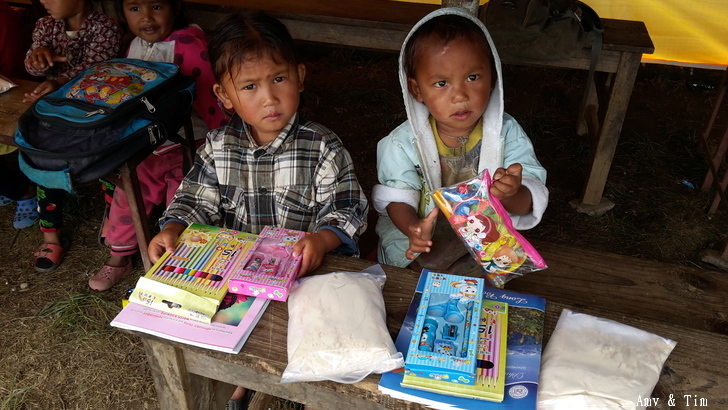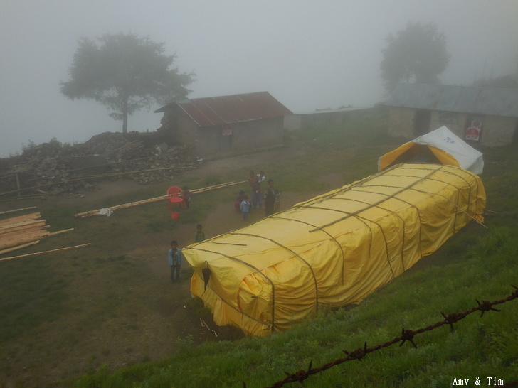 地震後把原來的教室給震垮了,黃色帳棚是臨時搭建的上課地點! 謝謝台灣朋友的愛心捐款,Amy幫你們把禮物背上2700公尺高山給孩子們! 謝謝村長和校長以及表哥的大力幫忙 原本預訂只發給學校的學生們,但沒想到全村的孩子都來了!