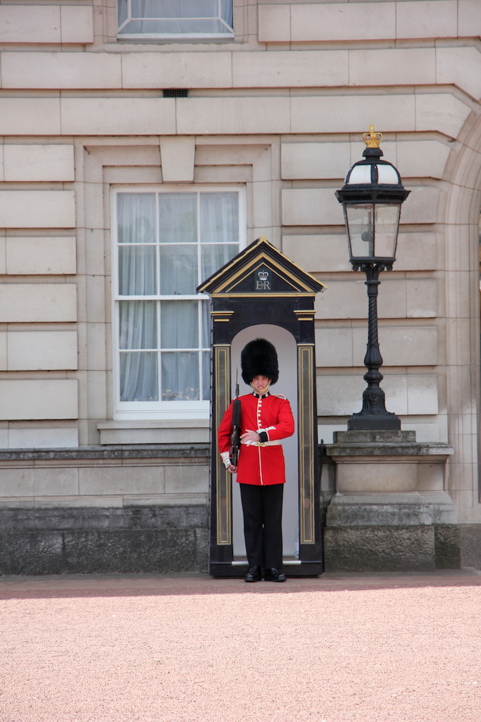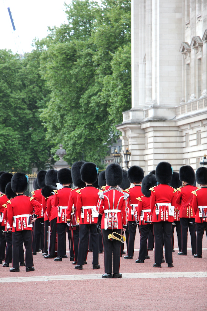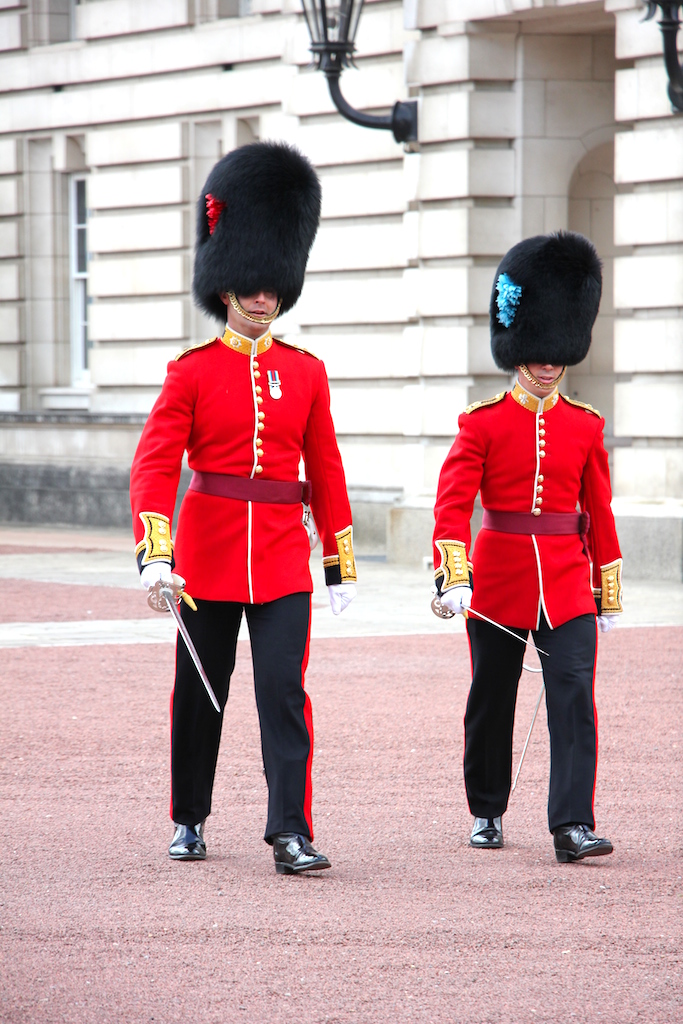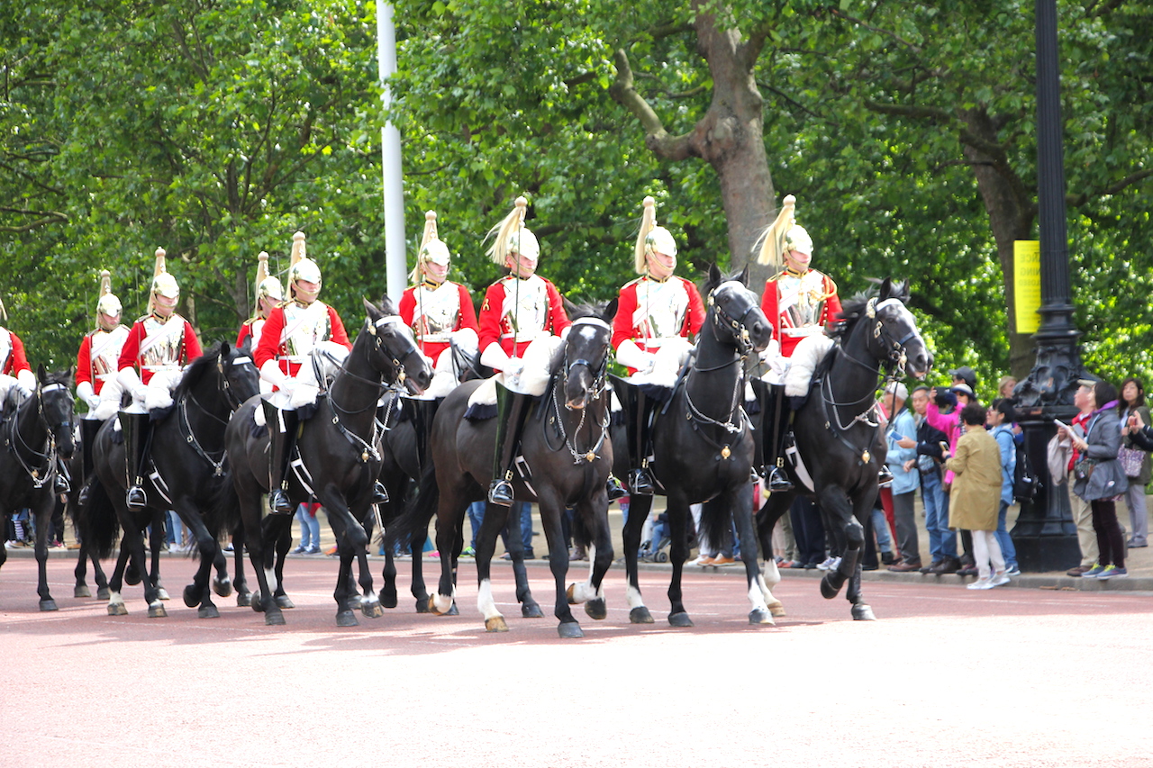 五月天,衛兵交接儀式每日舉行。清晨十一時開始,四十五分鐘的儀式,引來全球旅人的注目。白金漢宮正面廣場鑄鐵外人潮擁擠、維多利亞紀念碑也是擠得水洩不通。陽光普照天,聖詹姆士皇家公園的方向、綠園方向、海德公園角方向,大家紛至沓來,為親眼觀賞英國王室百年的衛兵交接儀式。這也是旅遊倫敦,絕不能錯過的王室文化特色。