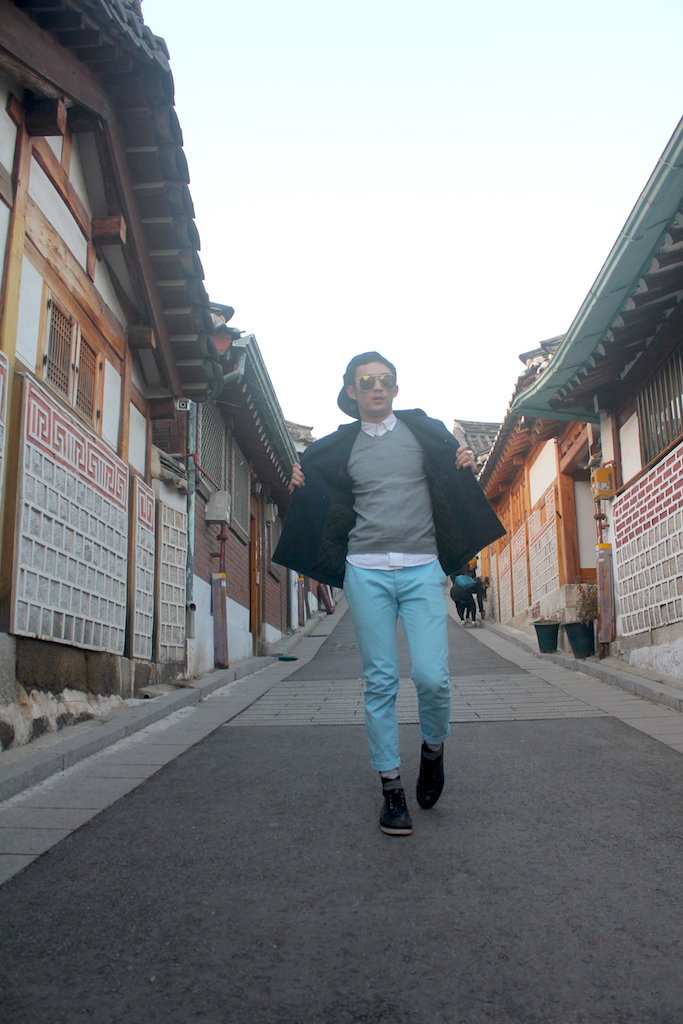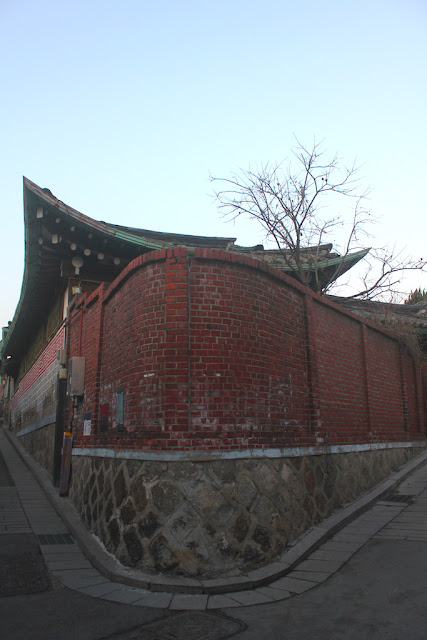 冬天,空氣凝聚,寒冬。北村小巷路,靜幽幽、悠閒的空間。時而寬、時而窄、時而住下坡、時而往上坡、時而平、時而斜;韓屋鱗次櫛比,格局韓式概念相同,但細節上,如屋門、盆栽、窗框、裝飾,不同點綴的手法,打造出別樹一幟的屋子。從一木、一石、一瓦,一紙建造;再進化到鋼鐵及玻璃,傳統與現代藝術共存的空間,把韓屋推上時尚美感的建築概念。撇開復古的畫面,在北村,也可以感受到現代藝術的氣息。小巷路的牆上,畫有趣味的圖畫。店鋪的裝潢,頗有當代設計感。