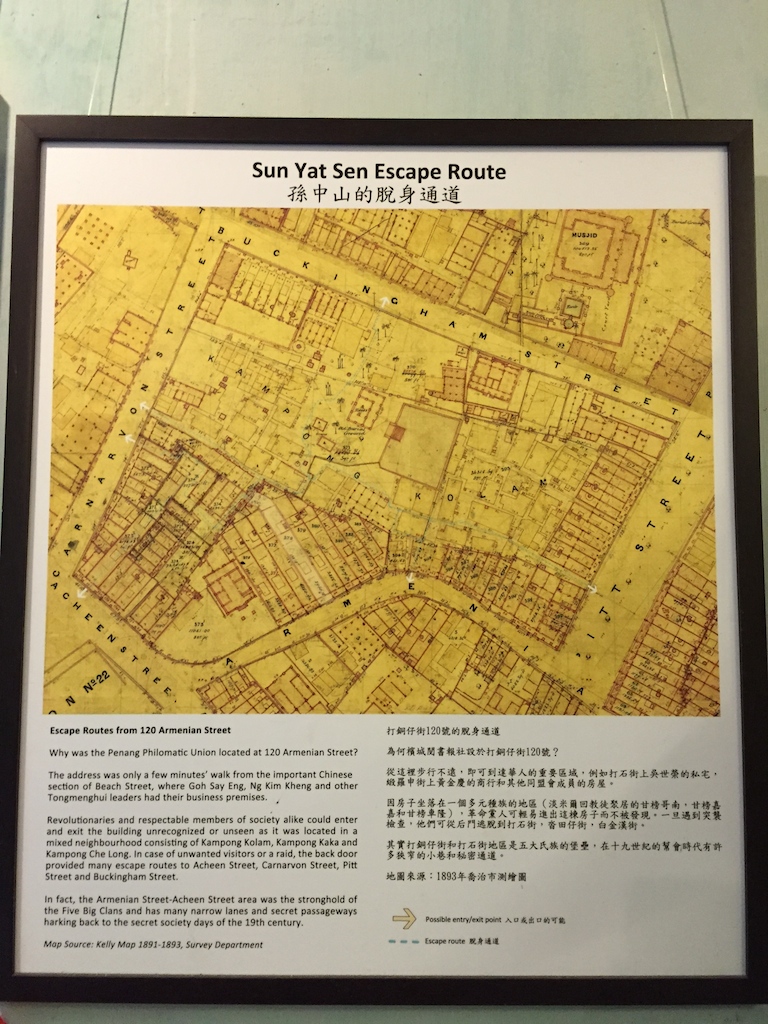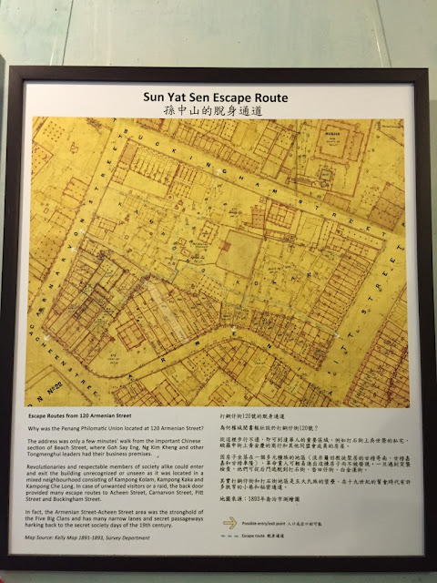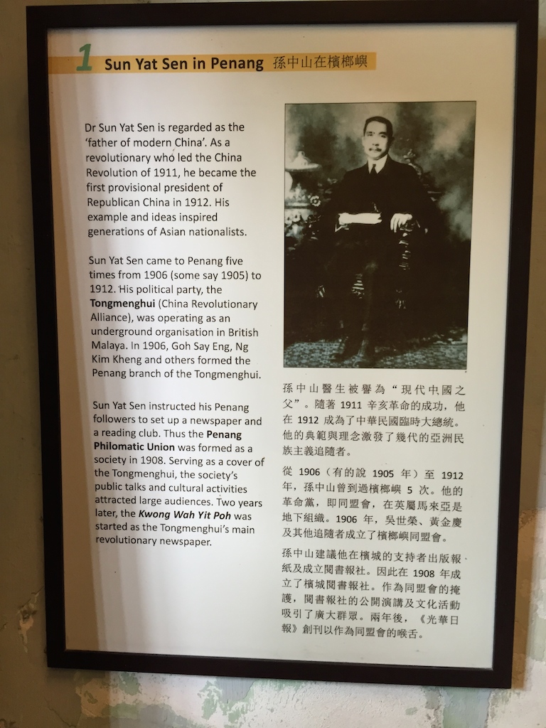 打銅仔街120號,大門懸掛者“莊榮裕”的匾牌,這乃商人莊忠水的商號。1926年至1993年,打銅仔街120號由莊忠水擁有,成為他家族的私宅。其繼母陳燕秀女士是女家長;她善於製作結婚用的娘惹糕。日劇時代結束後的1945年,家族商號“莊榮裕”先在此恢復營業。1993年,打銅仔街120號,已由其他家族購下。 房子瘦長的屋身裡還保留著其原來的風貌,即隱秘的天井小花園、精緻的實木樓梯、華麗的地磚及穿白灰牆而過的巨大橫梁。跨入屋內,典雅的鑲螺酸枝木傢俱及精雕細琢的雕花槅扇映入眼簾;在屋子的後部,配置著古老木柴火爐及廚房用具的傳統娘惹廚房,令人猶如步入時光隧道。 關於打銅仔街120號,最早可以追溯到1875年,最初的業主是謝裕生。但1900年,簽訂的產權轉讓契約顯示新產業主是林文耀。 孫中山檳城基地紀念館,經過精心修復戰前老街屋。如今己是一家博物館,館內設有“孫中山在檳榔嶼”的圖文展,介紹孫中山在檳榔嶼策劃1911年廣州起義的革命事蹟。它,曾是同盟會進行起義緊急會義的地點。也是檳城閱書報社的社址,該閱書報社是為孫中山革命活動做掩護而成立的。 打銅仔街120號,有很好的脫身通道,一旦遭到突襲檢查,革命黨人可以輕易從屋後逃往淡米爾回教徒聚居的甘榜柯南和甘榜嘉嘉。 1910年,孫中山在檳榔嶼,發生的重大的史遺,都跟打銅仔街120號有關。孫中山尋獲對其推翻滿清政權的支持,因而將同盟會南洋總機關部移設檳榔嶼(檳城)。此外,馬來西亞歷史最悠久的中文報《光華日報》也在這裡創刊。孫中山在此發表為1911年黃花崗起義籌款的動人演說,為辛亥革命揭開了序幕。 孫中山檳城基地紀念館,目前是檳城旅遊景點之一。到過的名人包括中國前國家主席胡錦濤、馬來西亞第四任首相敦馬哈迪醫生。這裡也是由趙文宣及李心潔主演的電影《夜。明》場景之一。 資料來源(第三段開始):邱思妮《孫中山在檳榔嶼》,孫中山檳城基地紀念館的圖文。 |
