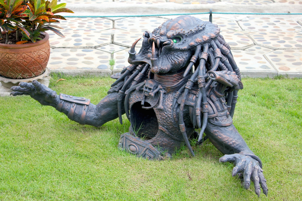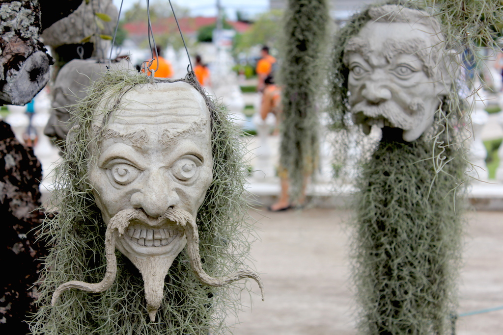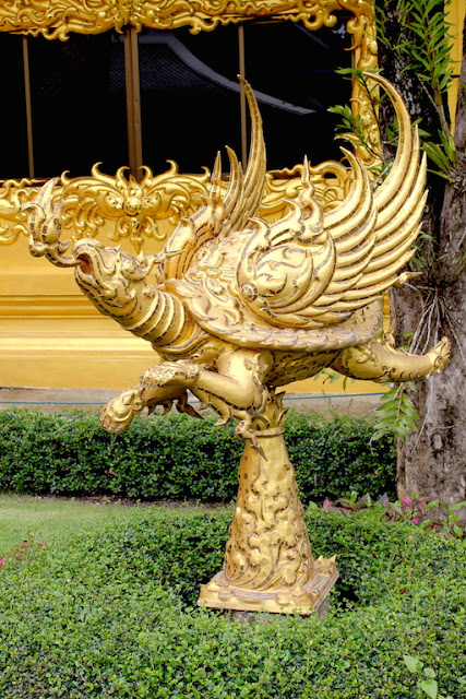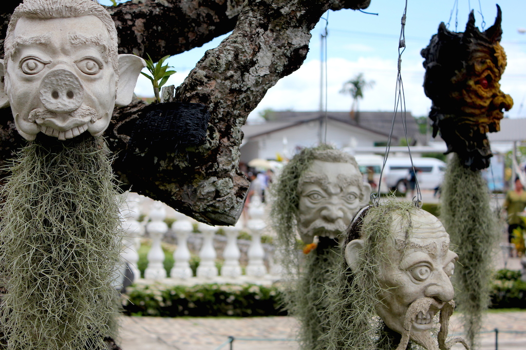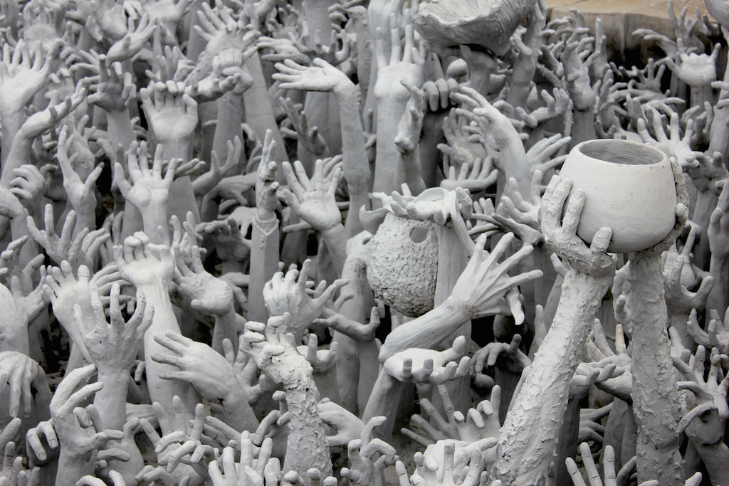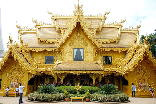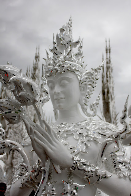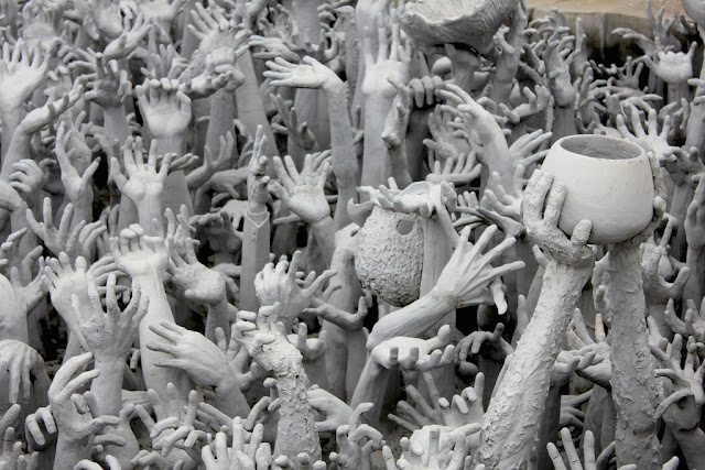 陽光普照,炎熱的氣候,白雲密佈底下的白廟,不愧是世界獨特的寺廟。精巧細琢的藝術,惟妙惟肖的雕塑,創意的概念,不僅僅是一建神聖的殿堂;反而設計者的天馬行空,工匠的巧奪天工,造就寺廟的外觀,豔麗奪目的建築。白廟,由泰國知名畫家,Chalermchai Khositpipat所設計,於1998年開始建始,至今仍未完竣。創作者,希望能藉此建築,將佛教與藝術完美融合,達到無以倫比的概念。 選用白色為主,因為白色正好象徵佛陀的純潔;而無所不在的鏡子,則寓意著佛的智慧照耀全宇宙。寺廟,顧名思義供奉“佛”的聖地;不過,在白廟的周圍,可以發現許多妖魔鬼怪的雕像,結合了古代神話及時代的機械。作品,只不過是藝術,況且矗立在佛廟,就不見得毛骨悚然。 “走進寺廟,別回頭,否則下地獄!”這是一位顧廟的工作人員講的。橋下的雕塑,千手乞討的視覺,仿佛地獄的囚者。映在湖面的白廟,栩栩如生,雖然白皙,不過華麗壯觀。刻劃精美的佛像,生動的雕龍,銀光閃爍的象牙,寺廟的裝飾與屋頂的燕尾等,圖案中鍍有銀色的金屬條帶,反射出奪目的光芒。無論從那一個角度看上去,沒有一處不讓人讚不絕口,具有魔法之光。就連洗手間,也如是金光閃閃,真是構思巧妙,如此用心打造獨特。 寺廟內的壁畫,融入了許多現代元素,給合宗教及宇宙大地,從神話到現代科技。畫家認為,能救宇宙及人類就是英雄。壁畫上的電影著名英雄人物如UltraMan,SuperMan,Doraemon,非常有趣,絕對無法在其他的寺廟看到,類似的創意。就連人類,如國家領袖,恐怖份子,都成了設計師的劃下。 杜甫的“筆落驚風雨,詩成泣鬼神”,在另一個領域,可以如是襯托,創造者厲害,造出不可思議的建築物。 |