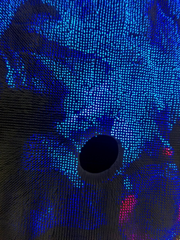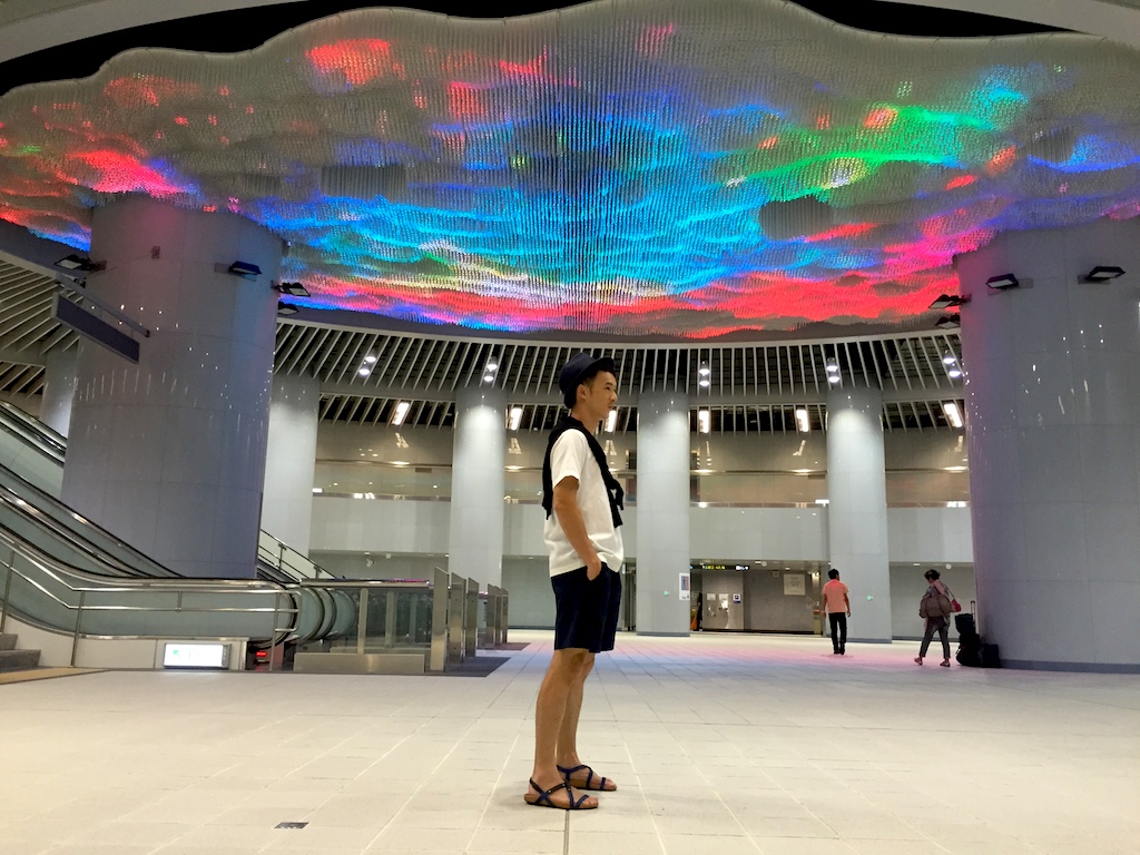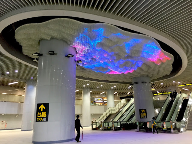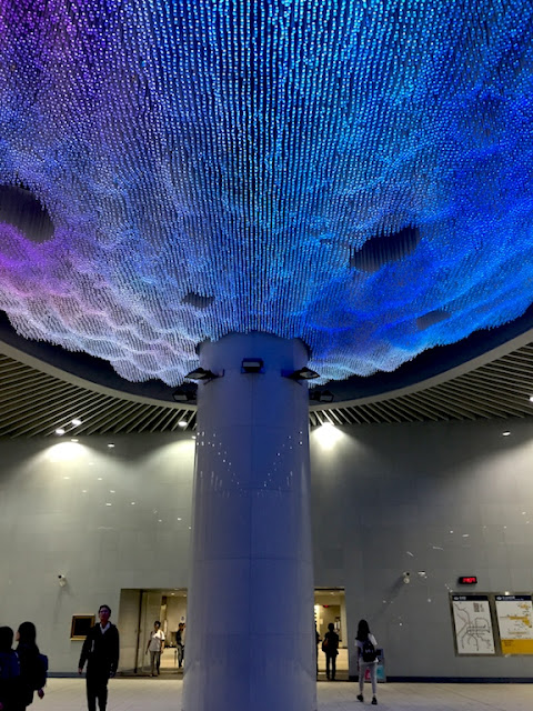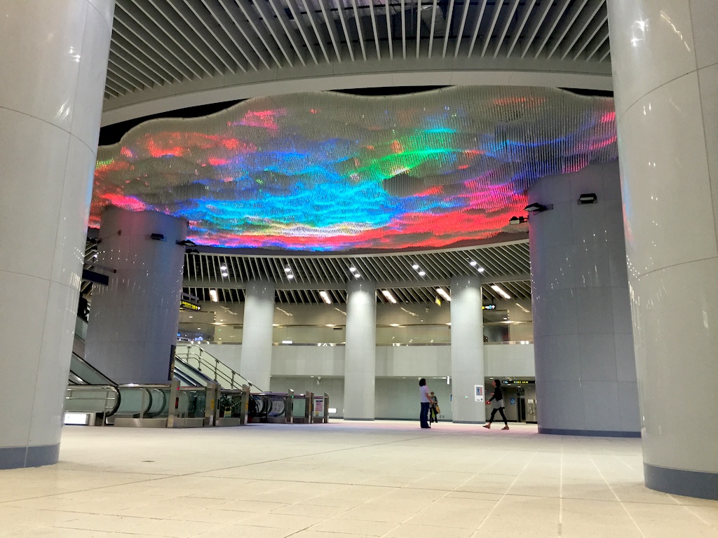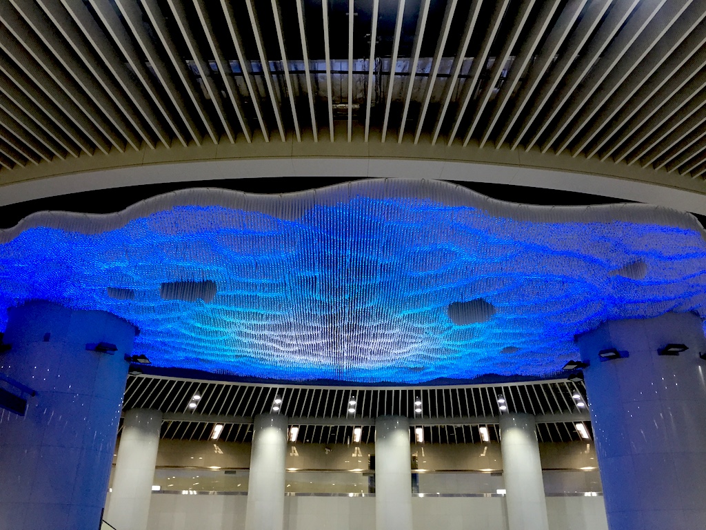 公共藝術,要懂得愛惜。視覺與認知,提倡個人的意識與知識。或是目不識丁,也或是完全沒有概念,就當做純粹欣賞。松山站的“河流彎曲之處,域見繁花光穹”,燈光璀璨,帶有“遇見”與“域見”重疊的空間詩意。剔透的數萬根管狀單元垂直錯落出高低起伏,通過萬顆的LED燈營造出絢爛的巨型光雕。未亮燈是,像一朵漂浮在高空的白雲;色彩的燈光亮時,一波波流動的像河流,頗有層次感,各角度的視覺體驗,也不同。