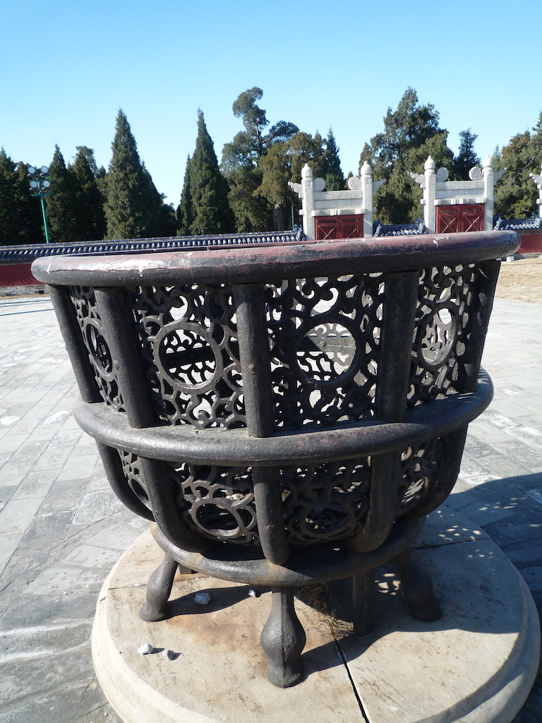 皇穹宇,祭天時使用的祭祀神牌都存放在這裡。它始建於嘉靖九年(1530年),初名泰神殿,是圜丘壇天庫的正殿。十七年(1538年)改稱皇穹宇。殿正中有漢白玉雕花的圓形石座,供奉「皇天上帝」牌位,左右配享皇帝祖先的神牌。正殿東西各有配殿,分別供奉日月星辰和雲雨雷電等諸神牌位。 回音壁,是天庫的圓形圍牆,環繞皇穹宇,呈弧形。因牆體堅硬光滑,是聲波的良好反射體,又因圓周曲率精確,聲波可沿牆內面連續反射,向前傳播。古人的聲學原理,可以從一道牆開始,絕對高超。如兩人分立於東、西配殿厚回音壁下,面被輕聲對話,雙方就能清澈聽到,一呼一一回一答,妙趣橫生。如果,去了天壇公園,不妨也到這裡嘗試。 圜丘壇,每年冬至在台上舉行“祀天大典”,俗稱祭天台。始建於嘉靖九年(1530年)。壇平面呈圓形,共分三層,皆設漢白玉欄板。圜丘壇的欄板望柱和台階數等,均採用9和9的倍數,以應“九重天”。通過對“九”的反覆運用,以強調天的至高無上的地位。上層中心為一塊圓石 在圜丘西南設有“望燈”,明清是為三座,1914年袁世凱祭天時伐倒兩根,現僅存其一。大典於黎明前開始,屆時“望燈”高懸欄頭,以警示全壇莊重嚴肅。除此之外,圜丘壇東西欞星門外各設鐵製鐐鑪兩座,用於焚化祭祀“從位”陳設供品。還有綠琉璃、圓筒形的燔柴爐,東西南面各出台階九級。燔柴爐,是舉行冬至祭天大典望燎儀時焚燒祭祀正位供奉物用的。