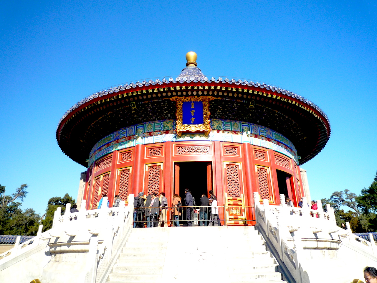 建築構造是“方”、是“長”或是“圓”,呈現不一樣的感觀與時尚美學。古人在幾何學的原理上,達到高水準的手段,構造出美輪美奐的建築物。個人覺得,圓形的構造,頗為顯著及獨特。 華麗的圖案,壯觀雄偉的建築。古人造屋的手法高超,不用一根釘的建築物,也能抵擋百年來的風雨吹打,聳立依舊。遠望三重藍琉璃瓦的祈年殿,矗立在三層的祈谷壇上,格外迷人,稱得上世界十大不可思議的寺廟。五百年前,以圓形作為構造,已是高超。加上建築的卡榫原理,古人在構想上,是如此細膩與精準。不用大樑和長檁,內部結構僅用楠木柱與枋桷相互銜接支撐屋頂。殿內有楠木柱二十八根,各皆有意義的象征。無論是殿內的大理石地板、蟠龍藻井殿頂、四周彩繪龍;還是外觀的圓形屋檐、攢尖頂、寶頂鎏金,都顯得十分富麗堂皇與宏偉。祈年殿,是天壇最早的建築物,建於明永樂十八年,原名為大祈殿、大享殿;乾隆十六年(1751年)修繕後,改為此名。 皇乾殿,於祈谷壇的北側, 從三座琉璃門通往。藍琉璃瓦廡頂、崇基石欄、殿前設月臺,月臺前方和左右陛各八級。皇乾殿,是平時供奉祈谷壇祭祀正位和配位神版的大殿。該殿初建於明永樂十八年,為五間廡殿頂的大殿。檐下懸掛“皇乾殿”匾額,為明朝嘉靖皇帝朱厚熜御筆。 從祈年殿一路往南走,踏出祈年門,走上丹陛橋,通過“成貞門”,必經“皇穹宇”及“回音壁”,後終抵達圜丘壇。這一趟天壇旅,卯足全力,東西南北各角落一探究竟。天壇公園非常寬闊,各式松柏古樹蒼翠參天環繞,氣勢宏大、肅穆與寧靜的氛圍。徐風飄盪,松柏婆娑,空氣冷得有點刺骨。畢竟,這裡是皇帝祭天的場所,地方縱然有氣派、排場絕對浩蕩盛大、澎湃洶湧的場面。