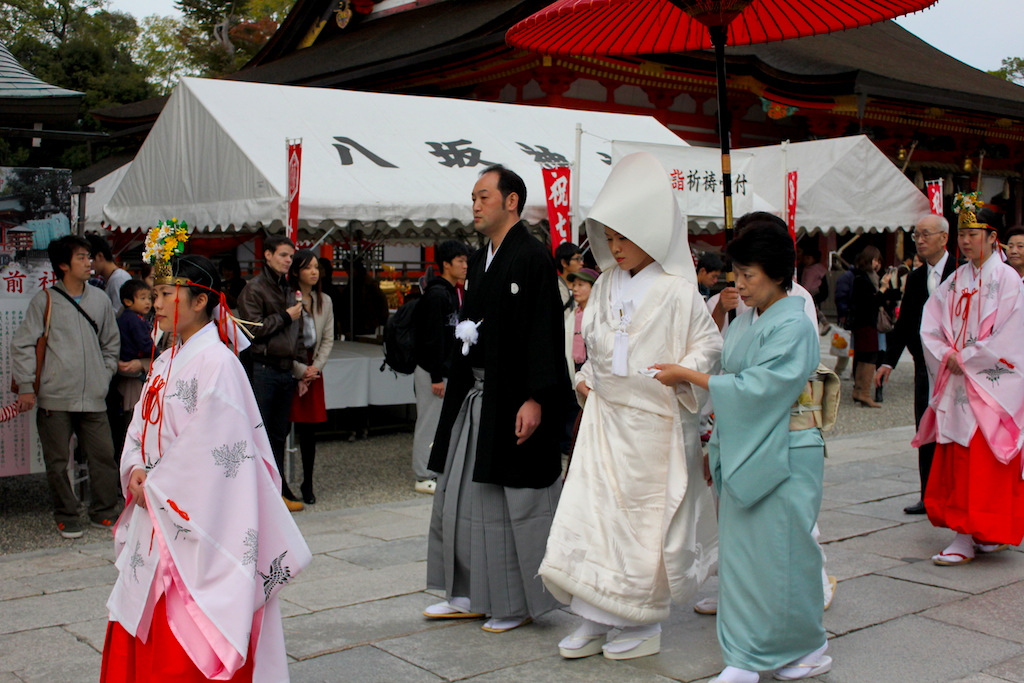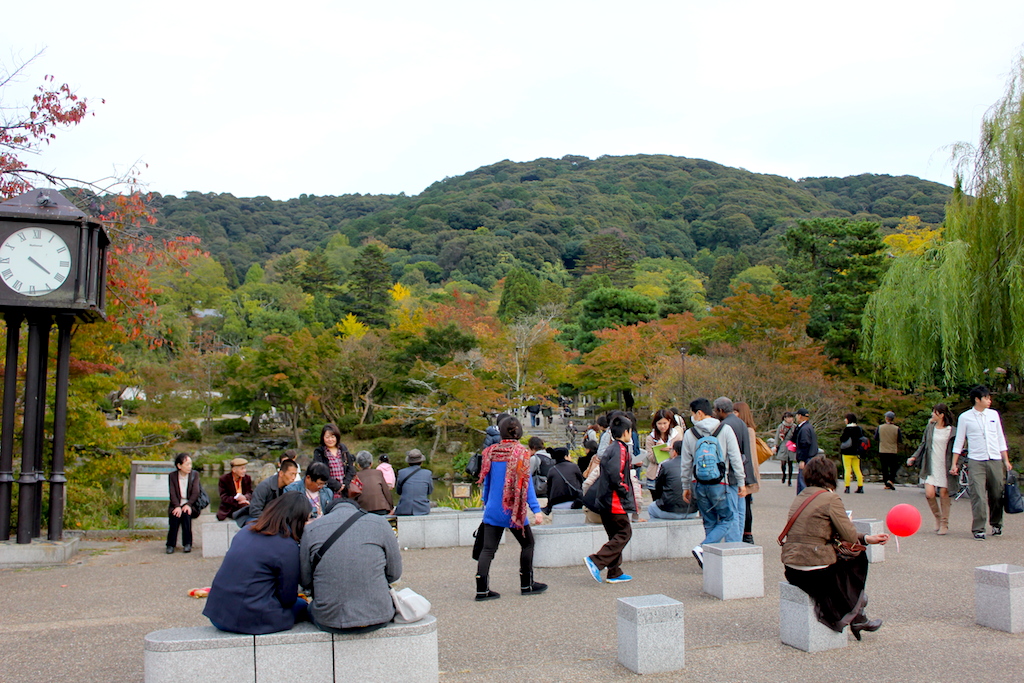 一)鶯張之廊下 二)白木之棺 三)忘傘 四)抜雀 五)三方正面真向之貓 六)大杓子 七)瓜生石 Maruyama Park 円山公園,是一座公開的場所,悠閒與寧靜。公園後方與蔥鬱的山林,茂密的楓樹環繞公園的小池。秋天賞楓葉,絕佳好去處。春天,這裡屬京都內最著名賞櫻花的公園。円山公園,卻有超過百年的歷史。 円山公園,人潮來來往往。它,位於知恩院及八坂神社的附近。情侶們甜蜜戀愛,你儂我儂。老人家,想必去寺裡祈福後,在公園歇息及散步。穿著和服,可愛的日本美眉,在小池旁喂鴨子吃飼料。 陶醉在京都的古色古香,彷彿有走不完的寺廟。不僅僅如此,日本人除信奉佛教;大部份人信仰神道教。神社,也是比比皆是。離開円山公園,走到橘色鮮明的八坂神社(Yasaka Shrine)。八坂神社,其祇園祭相當出名,是日本最大的祭典之一。八坂神社位於四條通東端,是本市香火最旺的神社之一。 神社舞台上的裝飾燈籠會在天黑時點亮,上頭帶有贊助商的名稱,通常都是京都當地公司行號。在八坂神社時,恰好遇上日本人傳統結婚進行式。對我而言,這是一間非常新鮮的事,我如是井底之蛙。 八坂神社橘色的西門樓,是日本現存最大的石牌坊千鳥居。站在這裡,前方就是京都市,最有名的街道祇園。秋天日間很短,黃昏很早就落幕,城市瞬間漆黑。 |