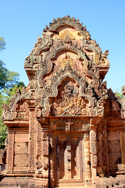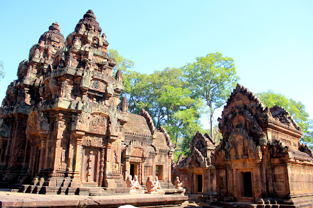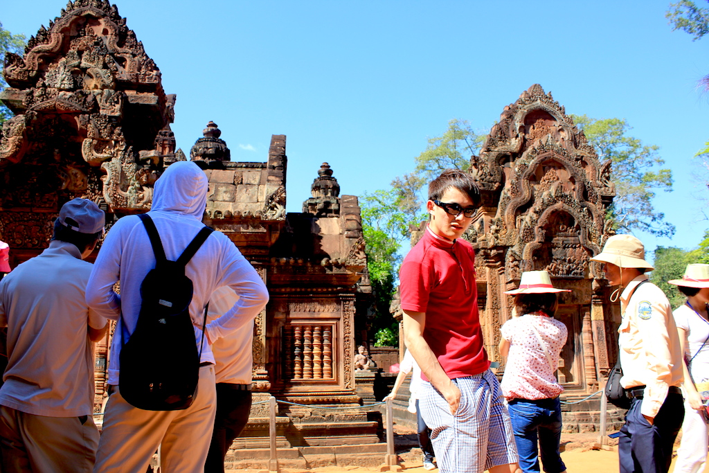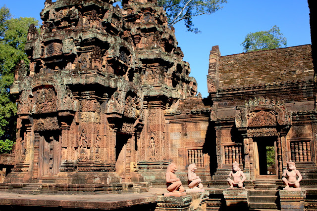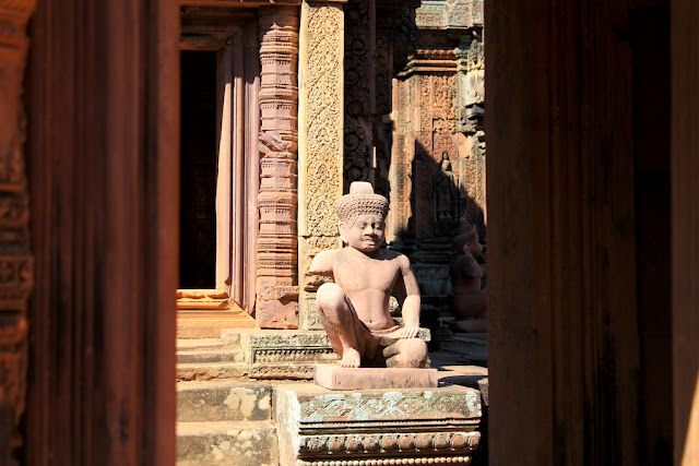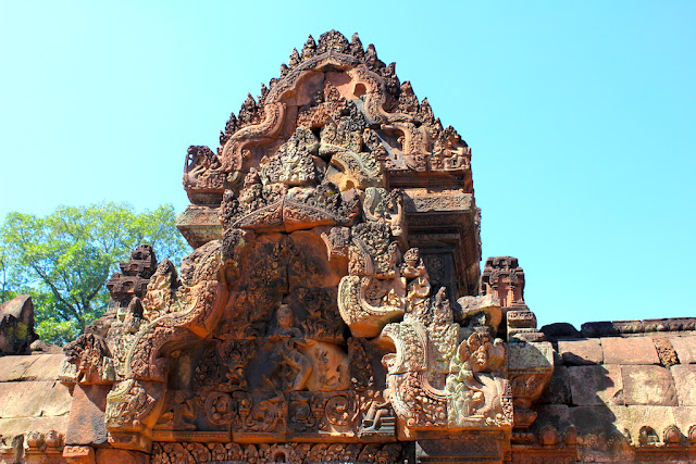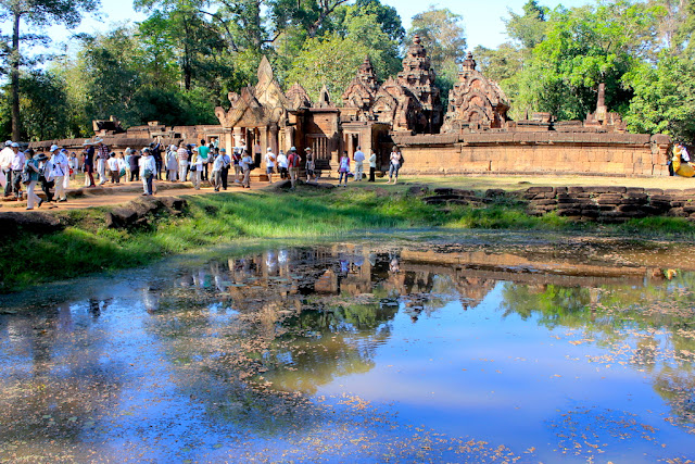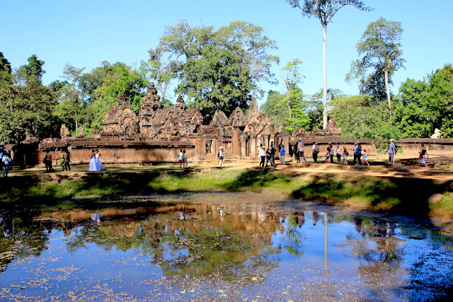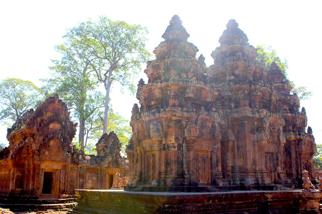 遙遠的路程,一個清晨就要出發。離開市區,路程難免顛簸,進入蓊鬱的叢林、經過鄉村風景的田園風光,踏入千年的歷史古蹟。嘟嘟車的車夫緩緩行駛,我享受沿路鄉下僻壤的風景,相機也無法招架周圍的美景。車夫開往大約兩小時的路途,前進影藏在叢林的一座神秘印度教建築,即女王宮(Banteay Srei)。 藍天白雲,早晨的陽光如此猛烈,女王宮在陽光的照射下,遠處一望,明顯看到整座建築的色澤,粉紅色砂岩而建成,散髮無窮美麗。通往女王宮,凹凸不平的鋪道,兩旁的蓮花座,依舊不朽。吳哥叢林里還有一座迷人的建築,尤其是映在護城河。女王宮,不算大的建築格局,但女王宮的浮雕栩栩如生,始終沒有腐朽,充滿印度神話的故事。 穿越在這座千年的建築,你不難不感受到震撼,古人就有一股力量,創造無限可能與猜不透的文物。這座淡紅色的曠世巨作,以砂岩作為建築材料,乃當時的國師Yajnavaraha所設計。女王宮,建於西元967年,屬於印度教寺廟,用來供奉婆羅門教三大天神之一的祭溼婆。建造歷經了兩位君主,開始於羅貞陀羅跋摩二世(Rajendravaraman)王朝,竣工於西元1002年,當時乃繼位者闍耶跋摩五世(Jayavarman V)王朝。 Banteay在高棉語中指的是“高牆”;而Srei則指的是“女人”,因此中文翻譯通常將Banteay Srei譯為“女王宮”。原名叫做Isvararupa。Banteay Srei則是近代對她的稱呼,有人認為,因為Banteay Srei神殿裡羅列的仙女雕得絕美脫俗,所以更適合以女性的角度命名。 精緻細膩的浮雕,不侷限于花草紋路。女王宮建築的浮雕,最具吸引的是三角門楣精彩的故事。女王宮,無一處不是浮雕,幾乎無法找不到任何一片沒有浮雕的表面。無論是牆面、立柱、門框、窗櫺,都有玲瓏精美的雕刻,藝術高超的巧手。浮雕的背後是有故事的雕刻,當中砒師奴下凡的故事、羅摩衍那(Rmayana)裡的情節、愛神卡瑪(Kama)化為灰燼又再度復活的故事、克里希納(Krishna)殺死暴君甘剎(Kamsa)的事蹟等等,沒有一處當下看出究竟與了解。 以下內容摘自:維基百科 女王宮,主建築群由三層院落圍成。原本在現存的三層院落之外,另有一道圍牆將神廟與市鎮相隔。這道外層的圍牆現在僅存拱門(即最東邊的瞿布羅),原來可能用木材建成。人們認為按照這道圍牆計算,女王宮的面積約500平方米。大門的山形牆上雕刻著印度教中守護東方的因陀羅——他端坐於長著三個頭的白象之上 。 第三層院落東西長110米、南北寬95米,由鐵礬土建成,東西軸的兩端分別開了兩道瞿布羅。兩道瞿布羅的山形牆均已不在原位。西瞿布羅的山形牆現由巴黎的吉美國立亞洲藝術博物館收藏,描繪了印度史詩《摩訶婆羅多》中阿修羅孫陀(Sunda)和烏普孫陀(Upasunda)兩兄弟爭奪飛天提絡塔瑪(Tilottama)的故事。東瞿布羅的山形牆散落在地上,描繪了印度史詩《羅摩衍那》中惡魔掠走羅摩的妻子悉達的故事。院落內的壕溝被鋪道沿東西軸切為南北兩。 第二層院落的外圍是一道東西長42米、南北寬38米的鐵礬土圍牆,內圍是一道邊長24米的正方形磚牆,外圍牆的東西軸開有兩道瞿布羅。外牆西瞿布羅的山形牆上雕刻著羅摩幫助猴王須羯哩婆殺死其兄波林的故事。內牆已經坍塌,僅剩東邊的瞿布羅和西邊的一座磚砌神殿;東邊瞿布羅山形牆上外側(朝東一面)雕刻著舞蹈的濕婆,內側則是難近母。院落里又有一圈鐵礬土的走廊,現在已經斷續地坍塌。走廊的其中一片浮雕描繪了獅面人那羅辛訶撕開魔王希蘭亞卡西普胸膛的場景。 三座粉紅色的鐘形寺塔,建在台基上。三座鐘形寺塔中,中間一座最高,裡面供奉著濕婆神,南面一座供奉的是梵天神,北面一座供奉的是毗濕奴神。寺塔高5層,每層都飾有各種神鬼羅剎雕像,形態各異。塔基及兩側的神龕和門樓上,也是千姿百態的浮雕,內容大多是記載古代高棉人民的生活情景和抵禦外族侵略的戰鬥場面。在中間寺塔右側的一座巨大的神龕上,完整地保留著一幅石雕「戰象圖」。這幅圖把當時高棉人民抗擊外族侵略的戰鬥場面再現在石壁上。寺塔各層門前都有一對守護獅石雕,右手持兵器,左手按在跪地的左膝蓋上,右腿半蹲式。頭部有的像猛獸,有的似鬼怪,外形彪悍勇猛,是婆羅門教三大神主的守衛者。 |