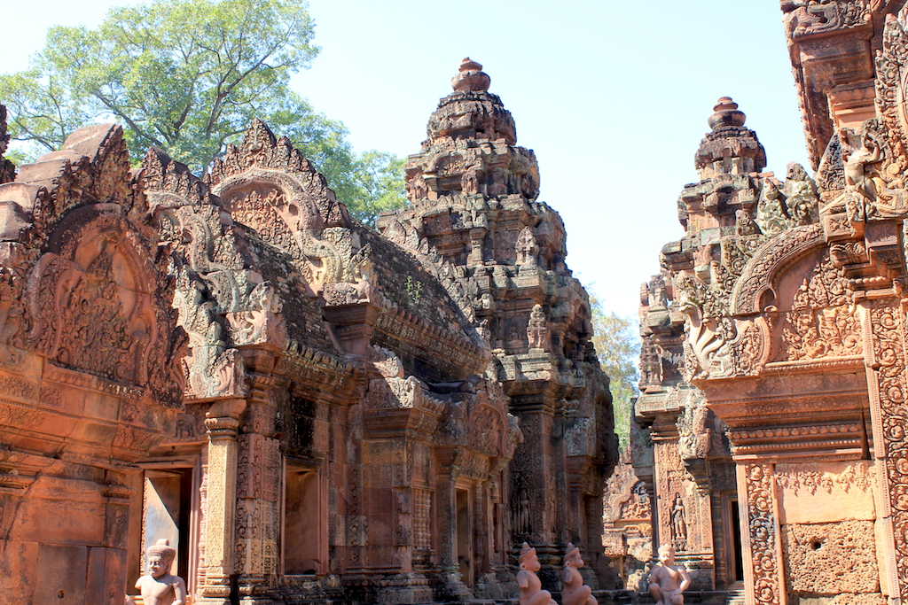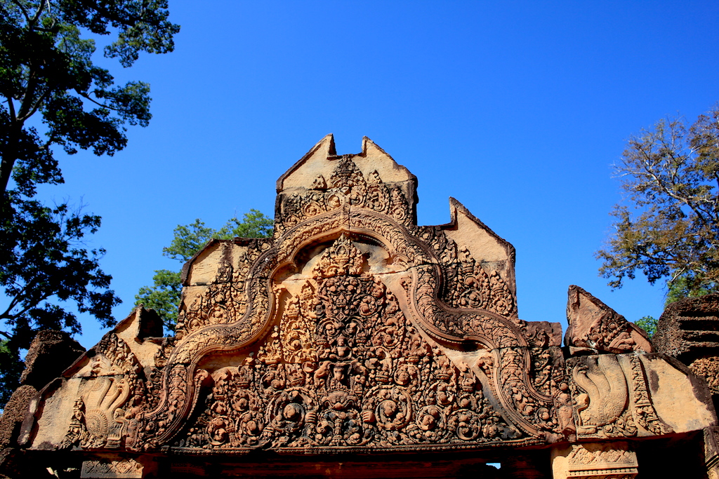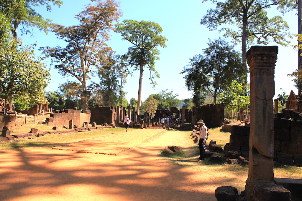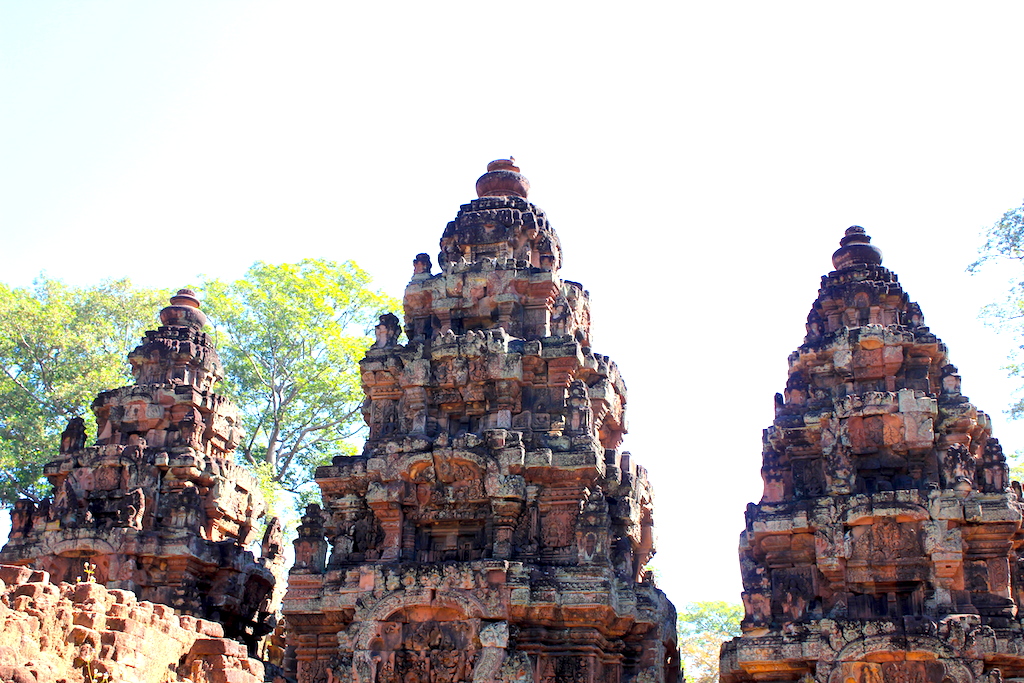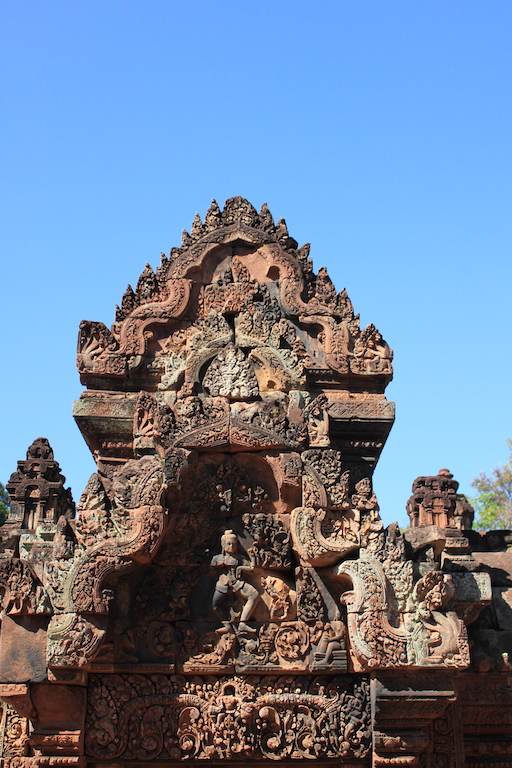 遙遠的路程,一個清晨就要出發。離開市區,路程難免顛簸,進入蓊鬱的叢林、經過鄉村風景的田園風光,踏入千年的歷史古蹟。嘟嘟車的車夫緩緩行駛,我享受沿路鄉下僻壤的風景,相機也無法招架周圍的美景。車夫開往大約兩小時的路途,前進影藏在叢林的一座神秘印度教建築,即女王宮(Banteay Srei)。 藍天白雲,早晨的陽光如此猛烈,女王宮在陽光的照射下,遠處一望,明顯看到整座建築的色澤,粉紅色砂岩而建成,散髮無窮美麗。通往女王宮,凹凸不平的鋪道,兩旁的蓮花座,依舊不朽。吳哥叢林里還有一座迷人的建築,尤其是映在護城河。女王宮,不算大的建築格局,但女王宮的浮雕栩栩如生,始終沒有腐朽,充滿印度神話的故事。 穿越在這座千年的建築,你不難不感受到震撼,古人就有一股力量,創造無限可能與猜不透的文物。這座淡紅色的曠世巨作,以砂岩作為建築材料,乃當時的國師Yajnavaraha所設計。女王宮,建於西元967年,屬於印度教寺廟,用來供奉婆羅門教三大天神之一的祭溼婆。建造歷經了兩位君主,開始於羅貞陀羅跋摩二世(Rajendravaraman)王朝,竣工於西元1002年,當時乃繼位者闍耶跋摩五世(Jayavarman V)王朝。 Banteay在高棉語中指的是“高牆”;而Srei則指的是“女人”,因此中文翻譯通常將Banteay Srei譯為“女王宮”。原名叫做Isvararupa。Banteay Srei則是近代對她的稱呼,有人認為,因為Banteay Srei神殿裡羅列的仙女雕得絕美脫俗,所以更適合以女性的角度命名。 精緻細膩的浮雕,不侷限于花草紋路。女王宮建築的浮雕,最具吸引的是三角門楣精彩的故事。女王宮,無一處不是浮雕,幾乎無法找不到任何一片沒有浮雕的表面。無論是牆面、立柱、門框、窗櫺,都有玲瓏精美的雕刻,藝術高超的巧手。浮雕的背後是有故事的雕刻,當中砒師奴下凡的故事、羅摩衍那(Rmayana)裡的情節、愛神卡瑪(Kama)化為灰燼又再度復活的故事、克里希納(Krishna)殺死暴君甘剎(Kamsa)的事蹟等等,沒有一處當下看出究竟與了解。 以下內容摘自:維基百科 女王宮,主建築群由三層院落圍成。原本在現存的三層院落之外,另有一道圍牆將神廟與市鎮相隔。這道外層的圍牆現在僅存拱門(即最東邊的瞿布羅),原來可能用木材建成。人們認為按照這道圍牆計算,女王宮的面積約500平方米。大門的山形牆上雕刻著印度教中守護東方的因陀羅——他端坐於長著三個頭的白象之上 。 第三層院落東西長110米、南北寬95米,由鐵礬土建成,東西軸的兩端分別開了兩道瞿布羅。兩道瞿布羅的山形牆均已不在原位。西瞿布羅的山形牆現由巴黎的吉美國立亞洲藝術博物館收藏,描繪了印度史詩《摩訶婆羅多》中阿修羅孫陀(Sunda)和烏普孫陀(Upasunda)兩兄弟爭奪飛天提絡塔瑪(Tilottama)的故事。東瞿布羅的山形牆散落在地上,描繪了印度史詩《羅摩衍那》中惡魔掠走羅摩的妻子悉達的故事。院落內的壕溝被鋪道沿東西軸切為南北兩。 第二層院落的外圍是一道東西長42米、南北寬38米的鐵礬土圍牆,內圍是一道邊長24米的正方形磚牆,外圍牆的東西軸開有兩道瞿布羅。外牆西瞿布羅的山形牆上雕刻著羅摩幫助猴王須羯哩婆殺死其兄波林的故事。內牆已經坍塌,僅剩東邊的瞿布羅和西邊的一座磚砌神殿;東邊瞿布羅山形牆上外側(朝東一面)雕刻著舞蹈的濕婆,內側則是難近母。院落里又有一圈鐵礬土的走廊,現在已經斷續地坍塌。走廊的其中一片浮雕描繪了獅面人那羅辛訶撕開魔王希蘭亞卡西普胸膛的場景。 三座粉紅色的鐘形寺塔,建在台基上。三座鐘形寺塔中,中間一座最高,裡面供奉著濕婆神,南面一座供奉的是梵天神,北面一座供奉的是毗濕奴神。寺塔高5層,每層都飾有各種神鬼羅剎雕像,形態各異。塔基及兩側的神龕和門樓上,也是千姿百態的浮雕,內容大多是記載古代高棉人民的生活情景和抵禦外族侵略的戰鬥場面。在中間寺塔右側的一座巨大的神龕上,完整地保留著一幅石雕「戰象圖」。這幅圖把當時高棉人民抗擊外族侵略的戰鬥場面再現在石壁上。寺塔各層門前都有一對守護獅石雕,右手持兵器,左手按在跪地的左膝蓋上,右腿半蹲式。頭部有的像猛獸,有的似鬼怪,外形彪悍勇猛,是婆羅門教三大神主的守衛者。 |
