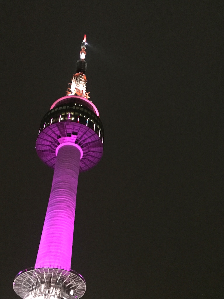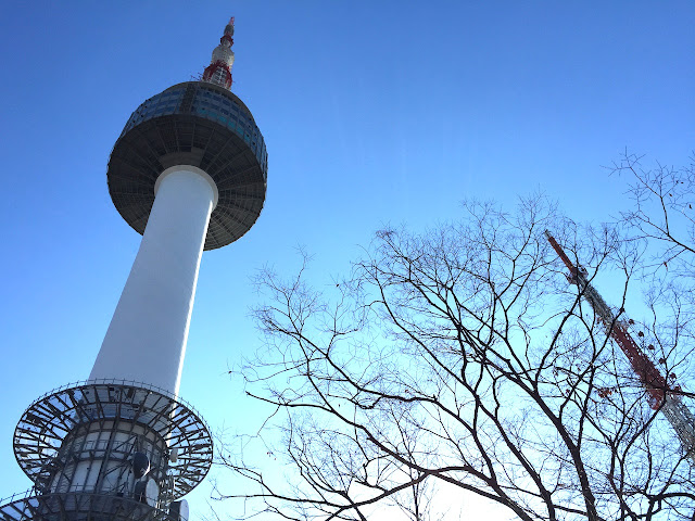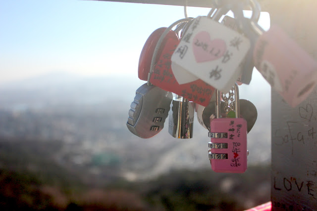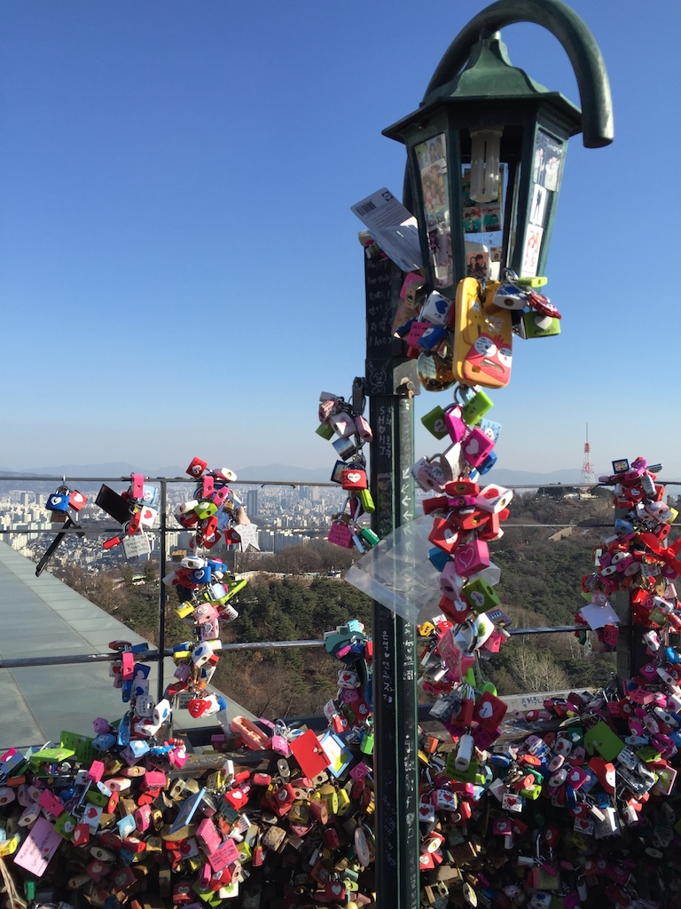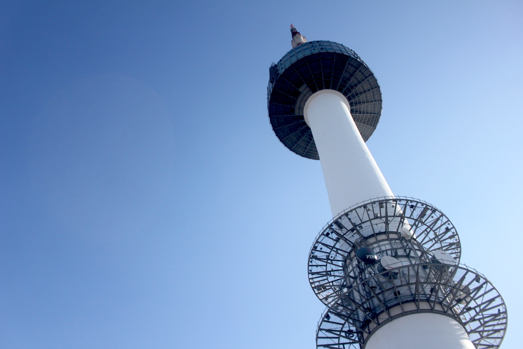 湛藍的天,從遠方的明洞眺望,南山首爾塔一目了然。登上首爾塔,360度觀賞首爾市的繁華都市鳥瞰。首爾塔聳立在首爾特別市龍山區的南山,建於1969年,236公尺高,集合旅遊觀光及電視發射為一體。首爾塔下,繽紛色彩的「愛情鎖」,充分讓人體會到溫馨與幸福。一個鎖頭不起眼,成千上萬的鎖,帶出別樹一幟的視覺效果,壯觀即藝術兼具。