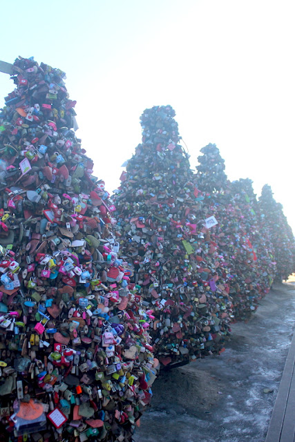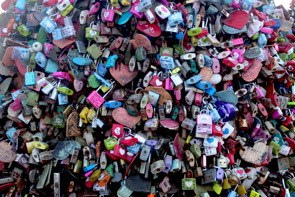 韓國南山首爾塔,滿滿的愛,鎖頭款式琳琅滿目。這是一種流行、也是一種藝術。就像法國巴黎塞納河上的藝術橋,意義非凡的地方,融入幸福的構思,成為旅客旅行 時,也會瘋狂追求。不僅如此,全球各地也為之瘋狂。無論是旅遊局,還是地方政府,都紛紛凝定景點,設立概念相同的「愛情鎖」。