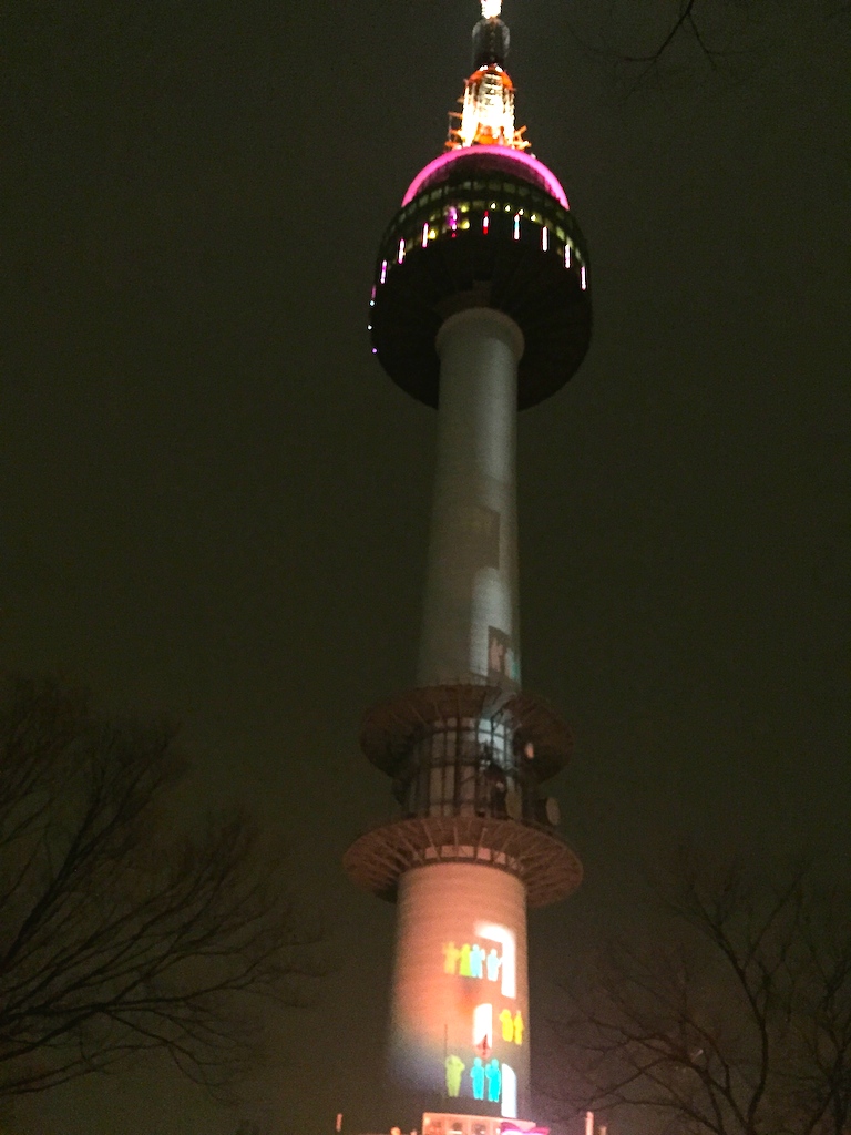 夜晚,南山首爾塔的亮了,夢幻般的燈光。每一夜,都換上不一樣的裝。首爾塔的燈光,利用嶄新的激光技術設計,投射出鮮明色彩的外觀。華麗的激光燈,每到夜晚的正點(7pm-12pm),就會呈現趣味的動畫視屏,還有音效。坐在古色古香的涼亭上,欣賞這燦爛的塔,流光溢彩。