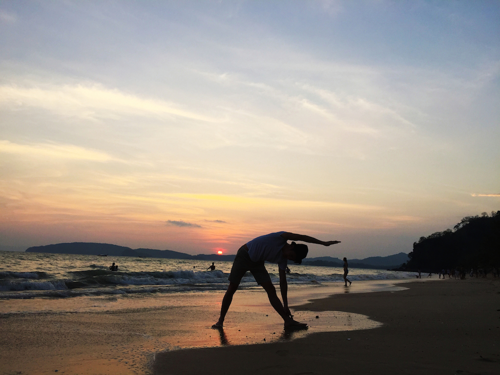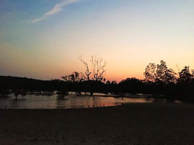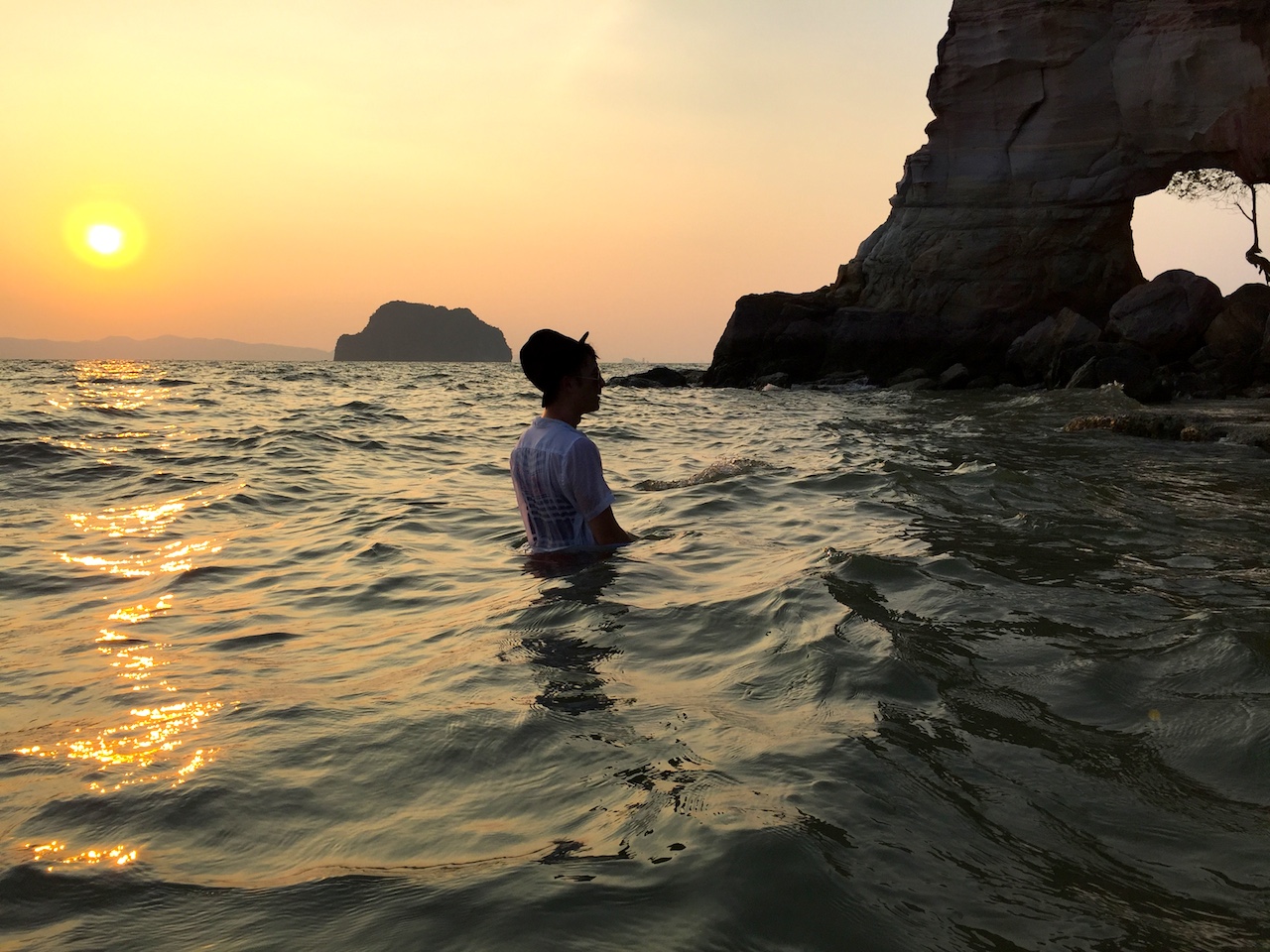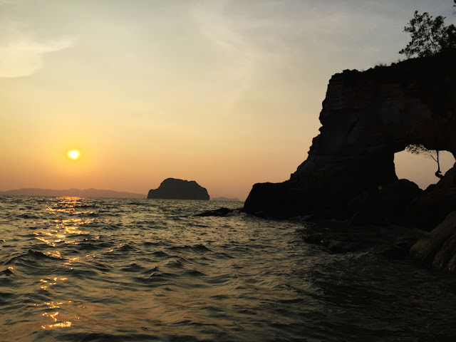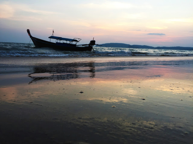 拗廊(AO NANG)沙灘,我選擇下榻的地方。距離甲米機場僅45分鐘左右的路程。機場出發,可以乘搭巴士直達酒店,票價150泰銖。旅遊甲米,多數人拗廊沙灘,吃喝玩樂,應有盡有。黃昏十分,非要到拗廊沙灘,守住夕陽餘暉一景不可。我喜歡在海灘,欣賞豔陽緩緩離開海岸線的景觀。手上一只冰淇淋,漫步海邊,聽著浪潮聲,凝視火紅的太陽,漸漸離去。一天,就將過去。