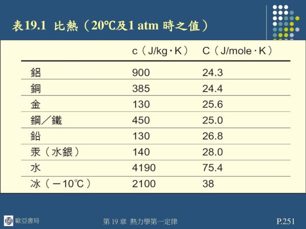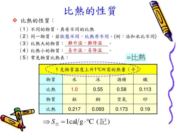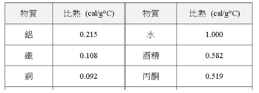 定量描述這種差異的物理性質即是比熱。 水的比熱為1.00 cal/g˙℃,水比任何普通金屬的比熱都高。