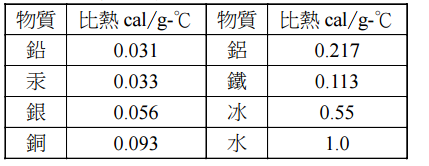 相同質量之鋁塊及鐵塊吸收相同數量之熱能,雖然熱能相等,但由此而引起之溫度變化卻不相同,鐵塊的溫升比鋁塊的溫升增加了一倍。
