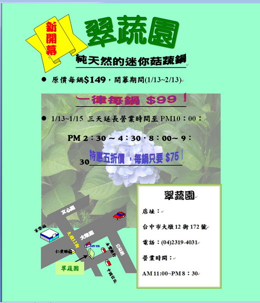 這是我們翠蔬園的˙開幕傳單,1/13牛年新春開幕喔!