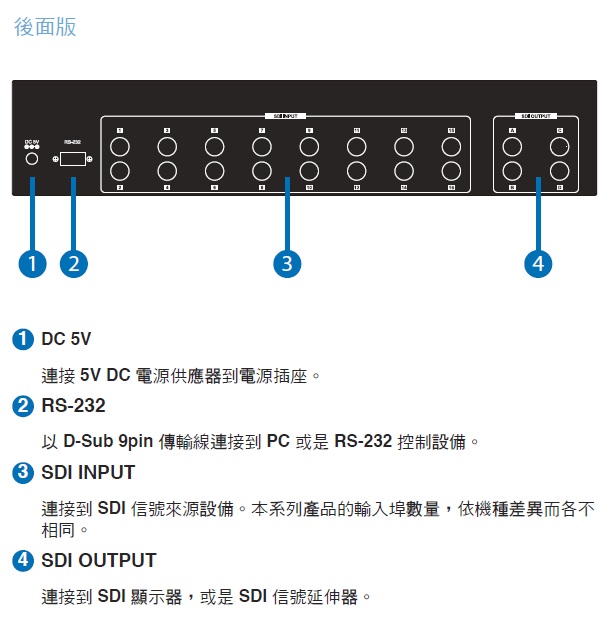 以下連接示意圖是以最大台的16進4出SDI矩陣機種為例,其他機型功能除了輸入數量不同,其他規格相同