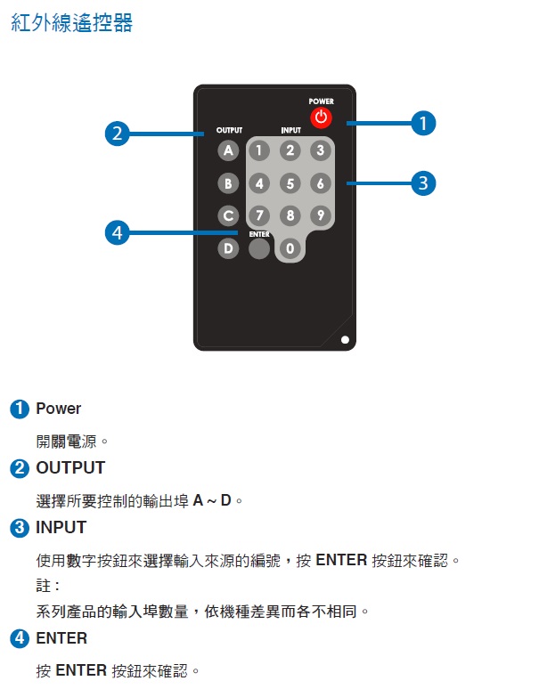 以下面板功能是以最大台的16進4出機種為例,其他機型功能除了輸入數量不同,其他規格相同